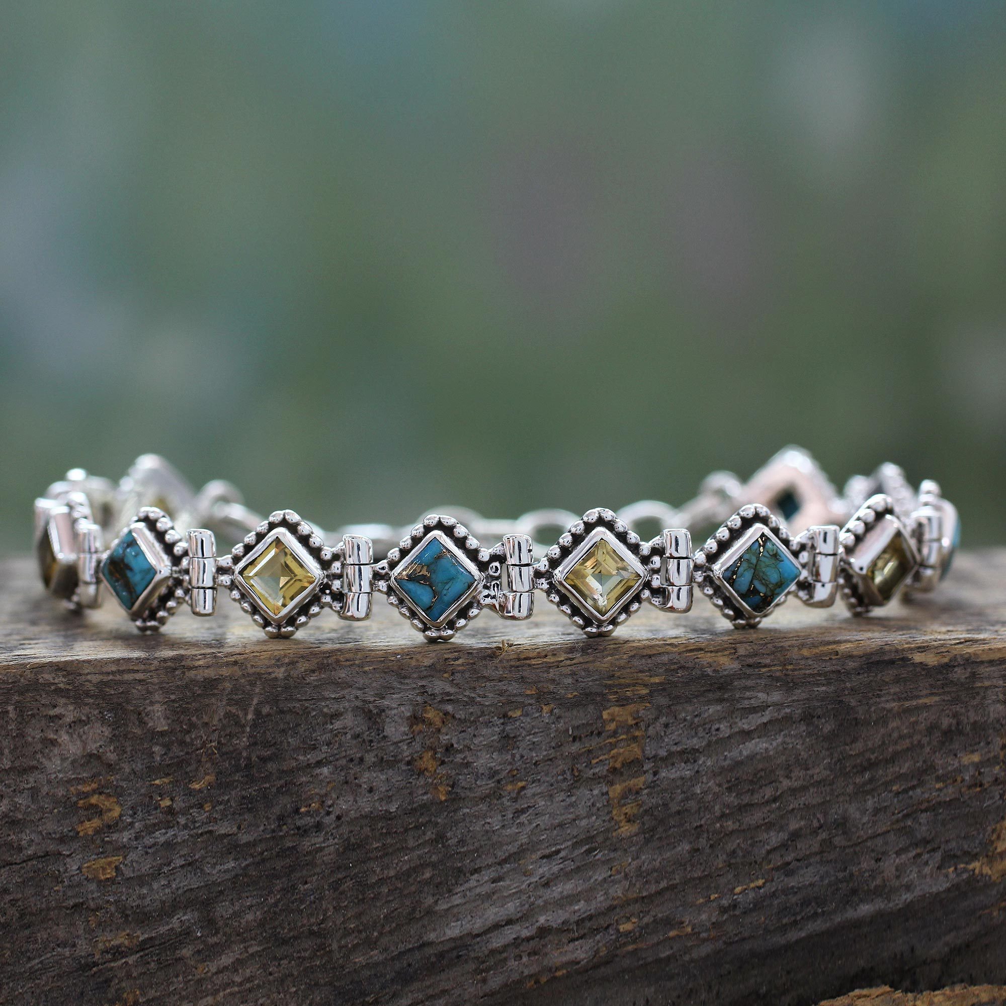 Neeru Goel presents a stunning bracelet that glistens with Indian style. Crafted of sterling silver, the bracelet alternates dazzling citrines and blue composite turquoise.
