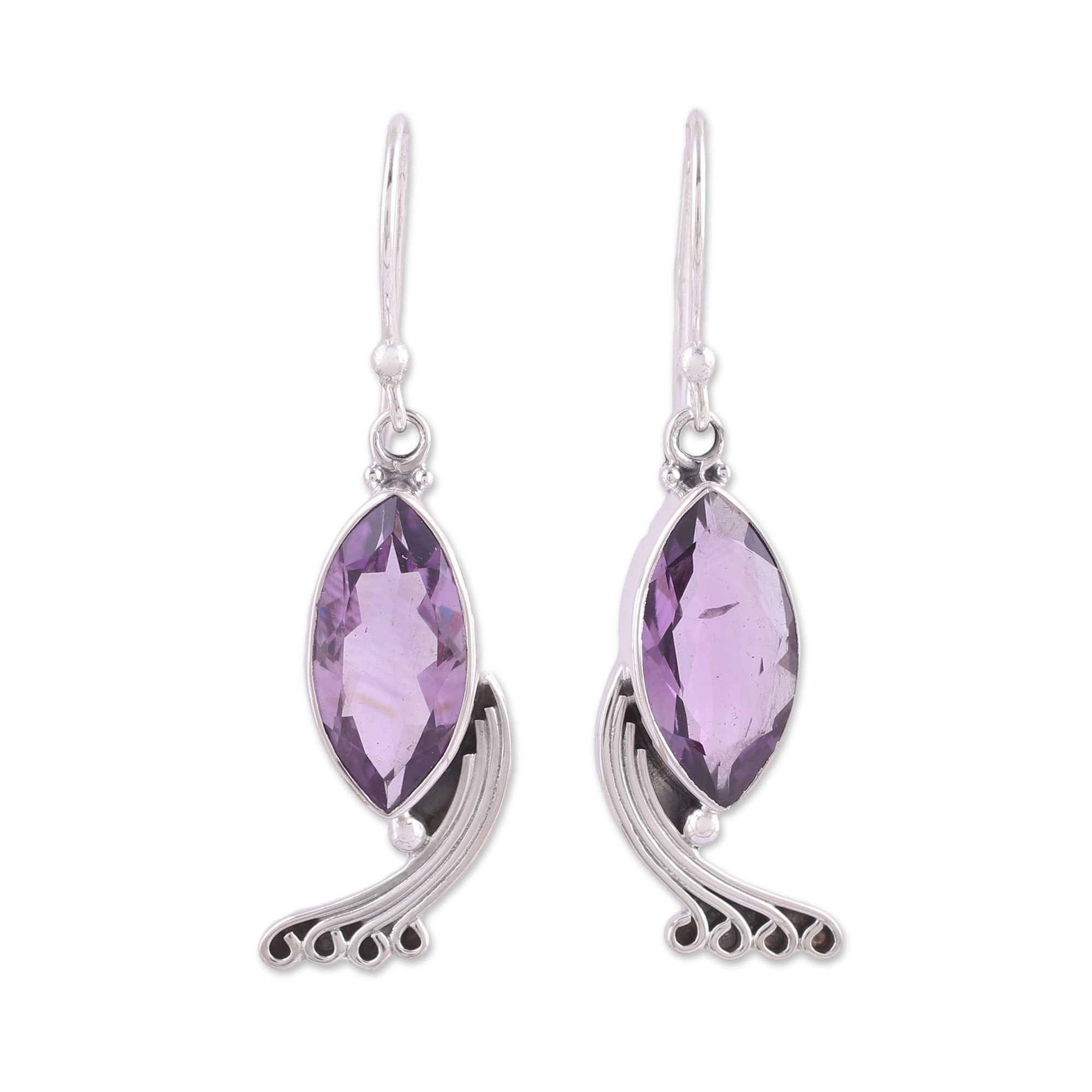 Curving sterling silver ribbons emulate the elegant sweep of a peacock's tail in these earrings from Neeru Goel. Eight carats of faceted amethysts lend added splendor with their marquise shape and royal purple color, a fitting homage to India's national bird.