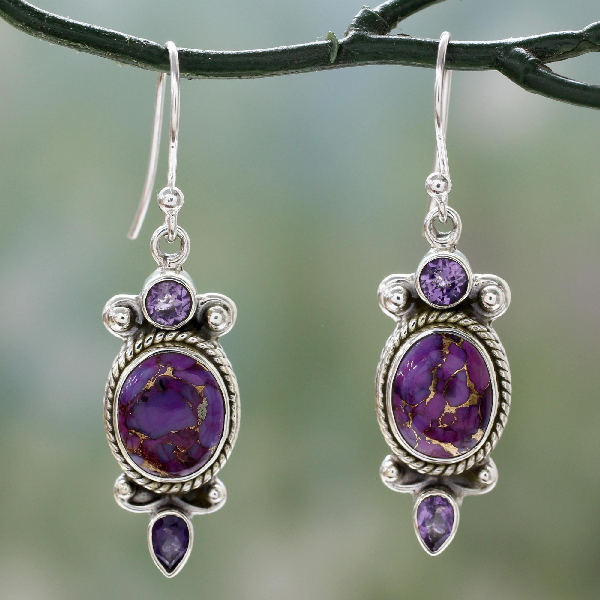 Fresh lilac-hued amethyst gems flank oval cabochons of dreamy purple composite turquoise in these dangle earrings from India's Neeru Goel. Rope-edged bezels and tiny silver balls complement the stones in this original sterling silver earring design. They swing from sterling silver hooks.