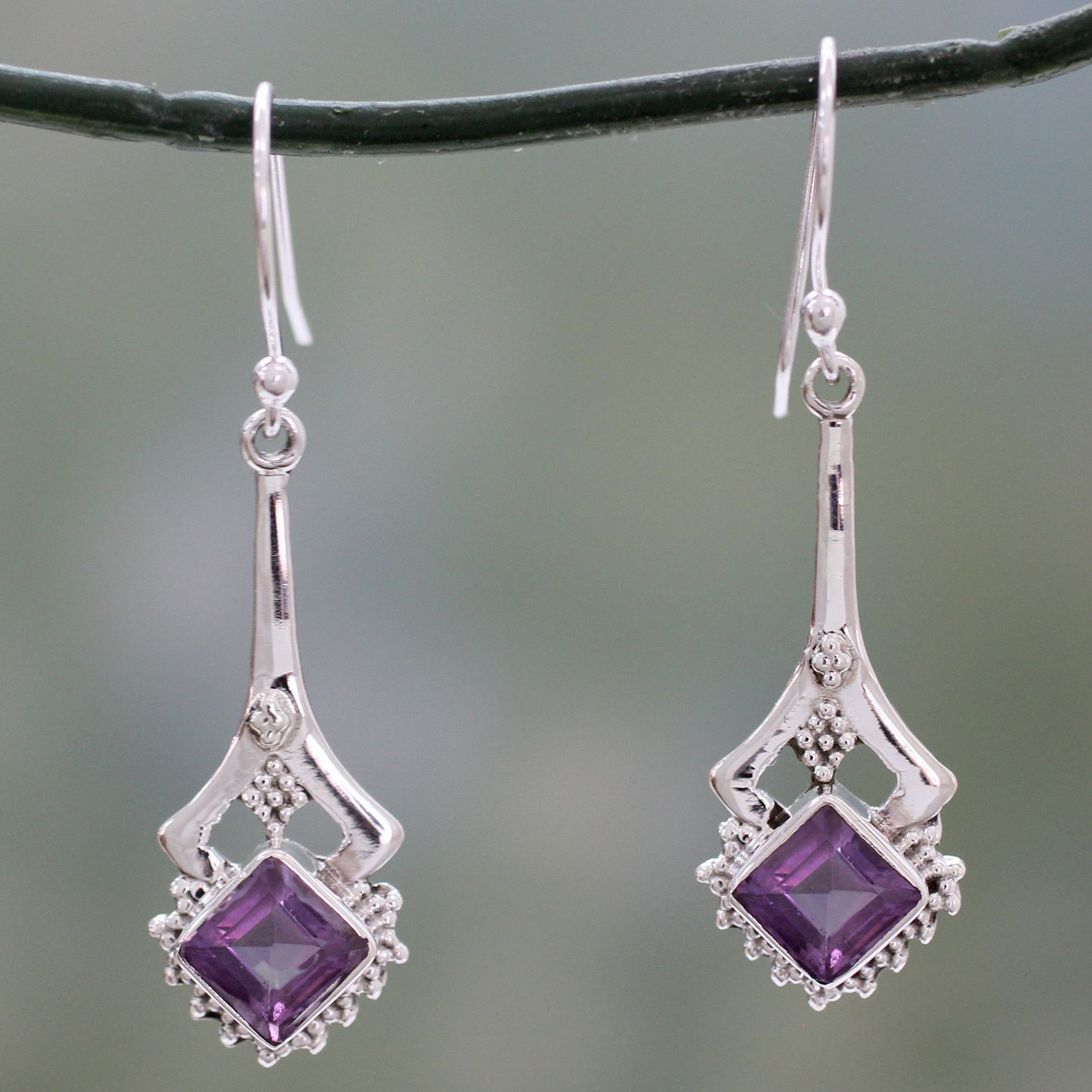 Indian Artisan Amethyst Dangle Earrings in Sterling Silver, 'Modern Jaipur'
