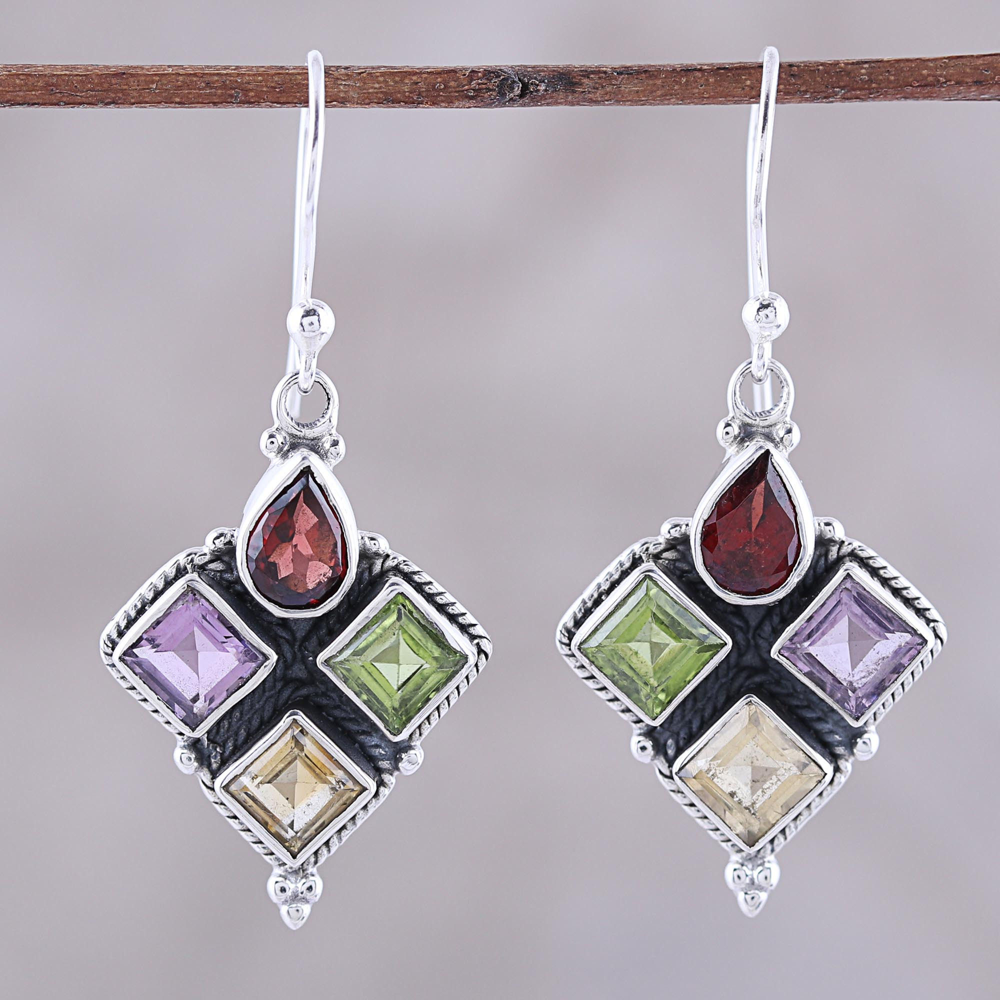 Indian Garnet Citrine Peridot and Amethyst Dangle Earrings, 'Sparkling Quartet'