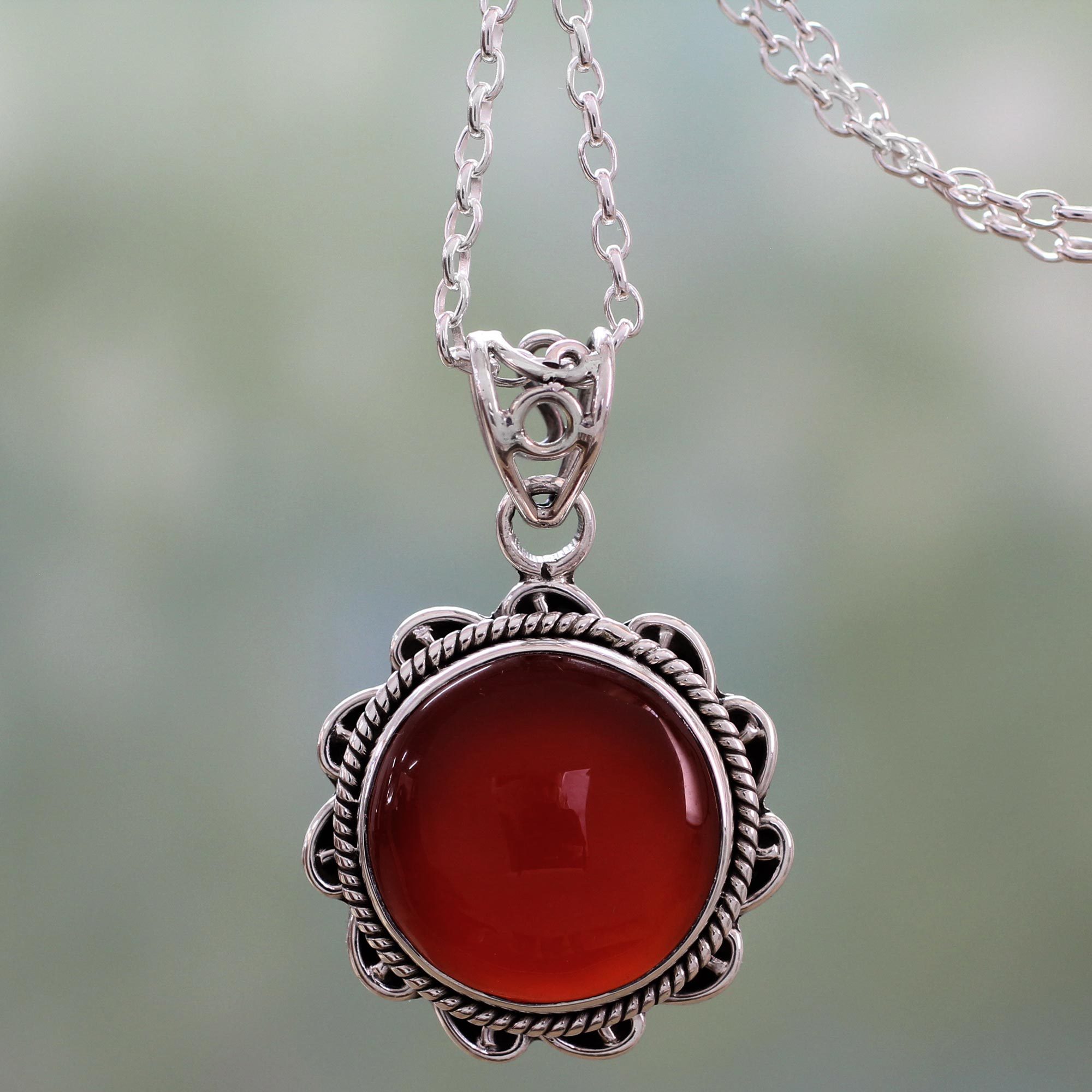 Indian Handcrafted Sterling Silver and Carnelian Necklace, 'Burst of Passion'