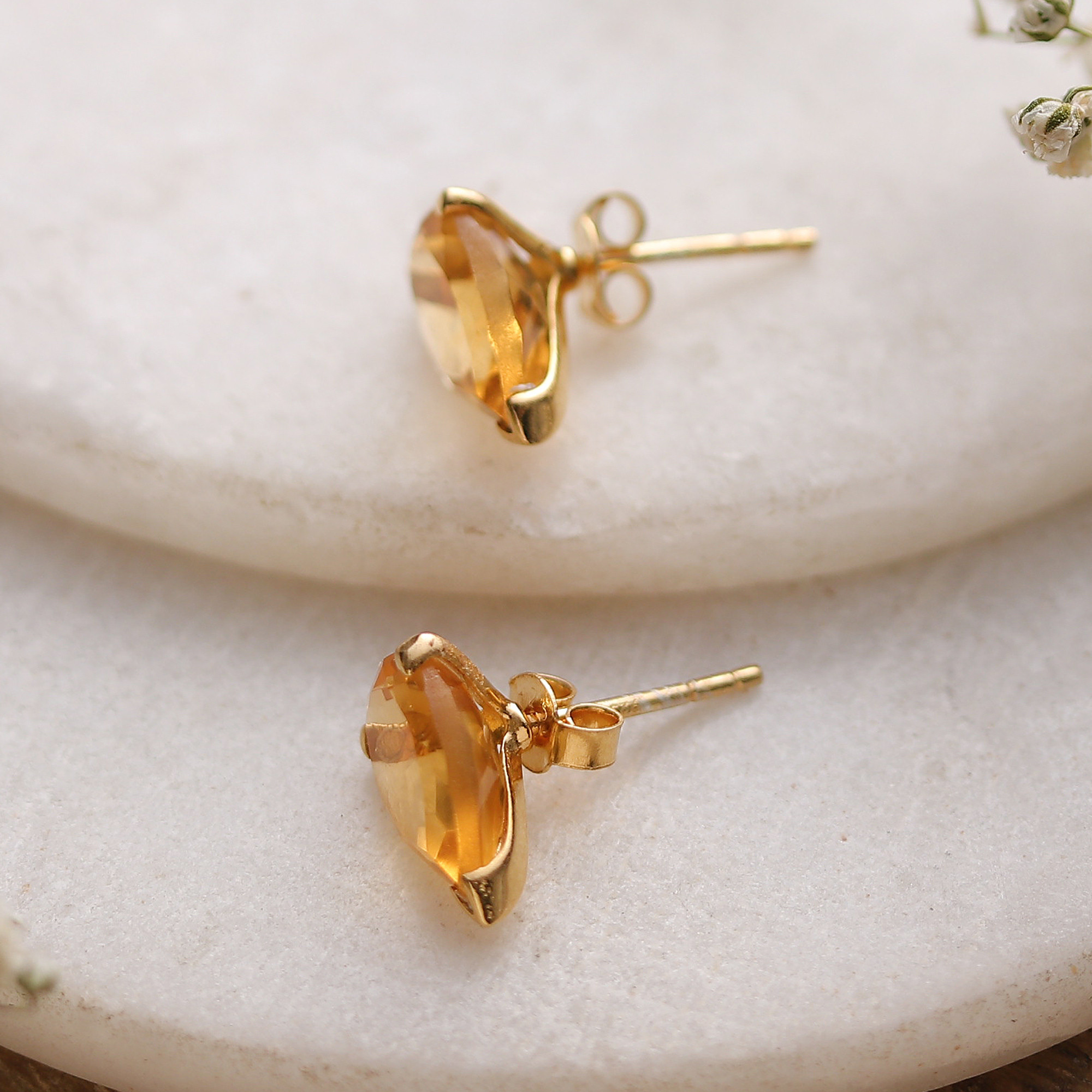 Embraced by 22k gold-plated sterling silver prong settings, two faceted pears of yellow citrine sparkle radiantly in this pair of stud earrings, totaling three carats. Presented by Alok Jain of India, these earrings are crafted by local artisans, who complete the accessories' solar gleam with a high polish finish.