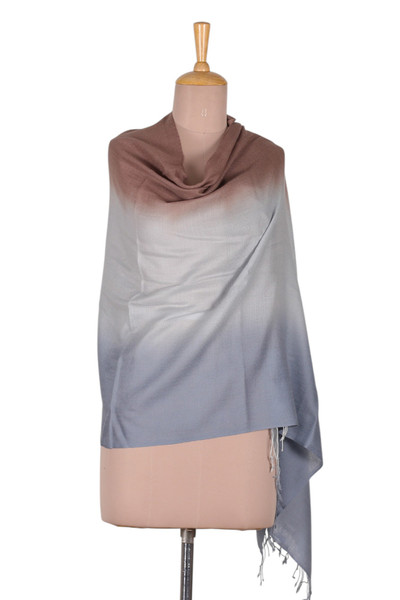 Indian-Made Ombre-Patterned Blue and Brown 100% Wool Shawl, 'Periwinkle Sweet'