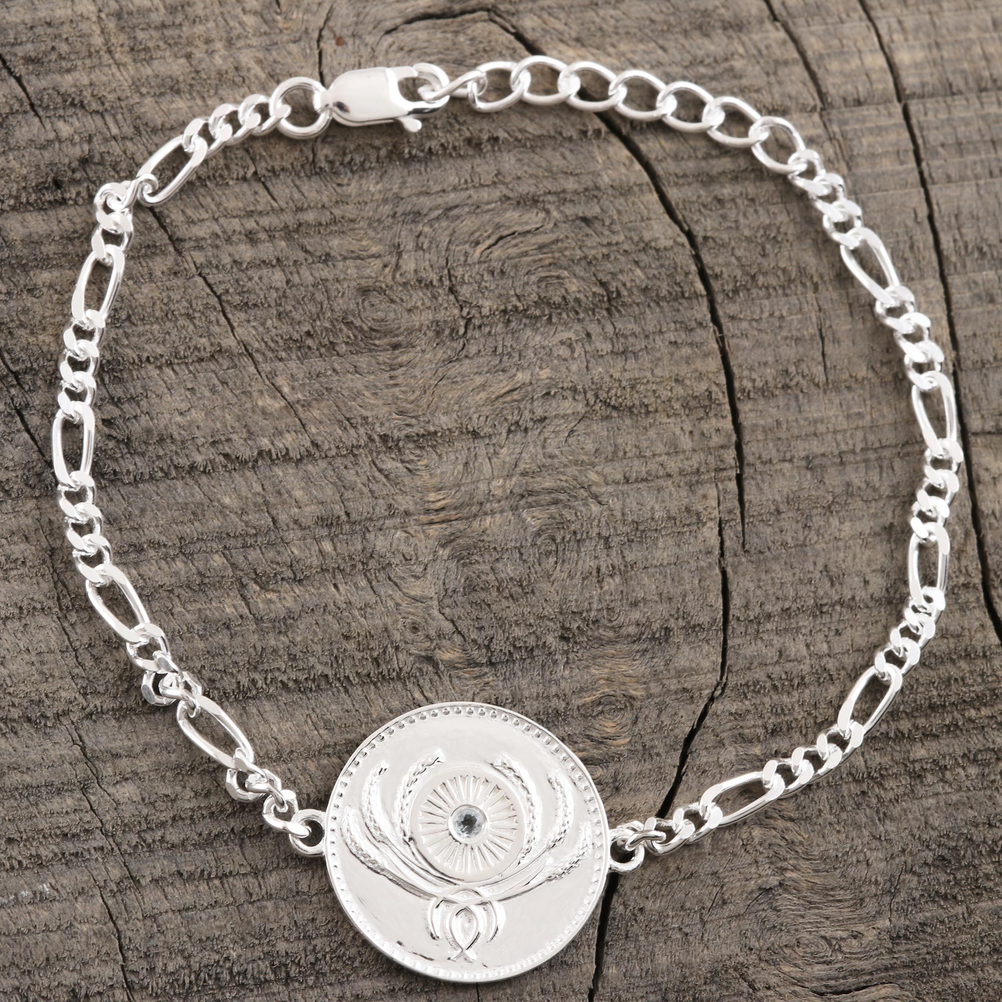 Blue topaz centers a chakra motif in sterling silver. This beautiful unity bracelet from Alok Jain celebrates our sameness in diversity. "The Ashok chakra, or 'wheel of duty' has 24 spokes that represent the 24 religious paths of humanity, and all lead a nation on a path of progress," he explains. Six sprigs of rice flank the wheel. "Rice is part of India's a cultural identity and also symbolizes global unity, as almost half of the population on this earth eats rice."