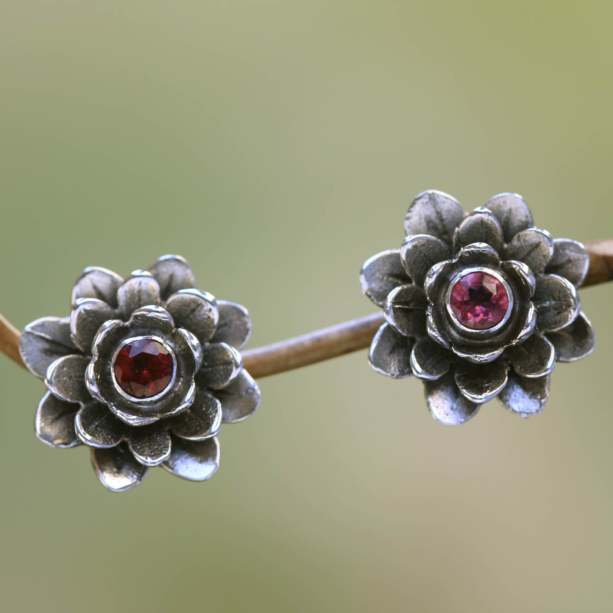 Indonesian Garnet and Sterling Earrings, 'Lotus in Bloom'