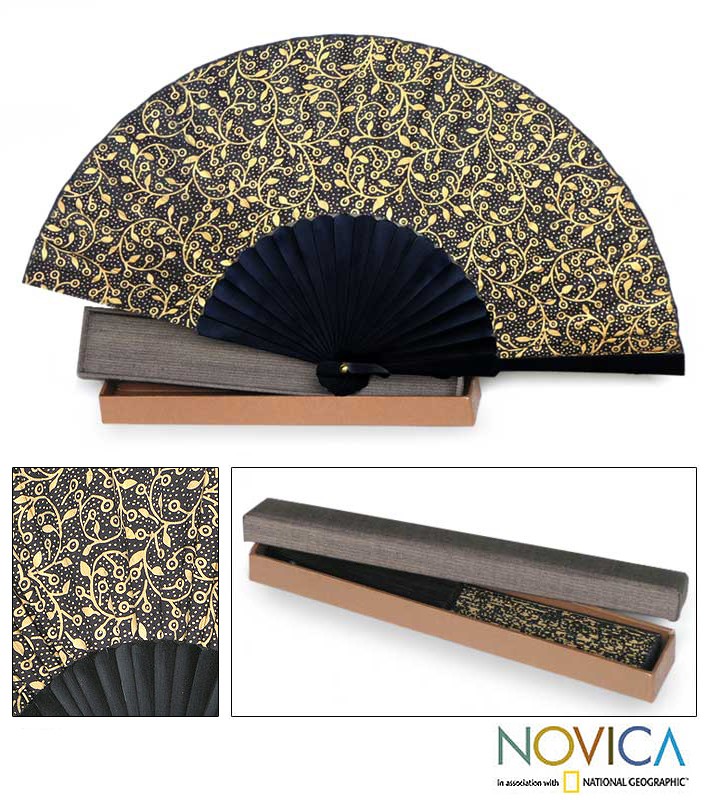Golden vines weave a pattern on midnight silk batik. From Melati's Collection in Indonesia, the silk on this fan is part of a larger textile; motifs and color could vary slightly. The bright contrast of gold on black silk makes this fan truly eye-catching and unique.