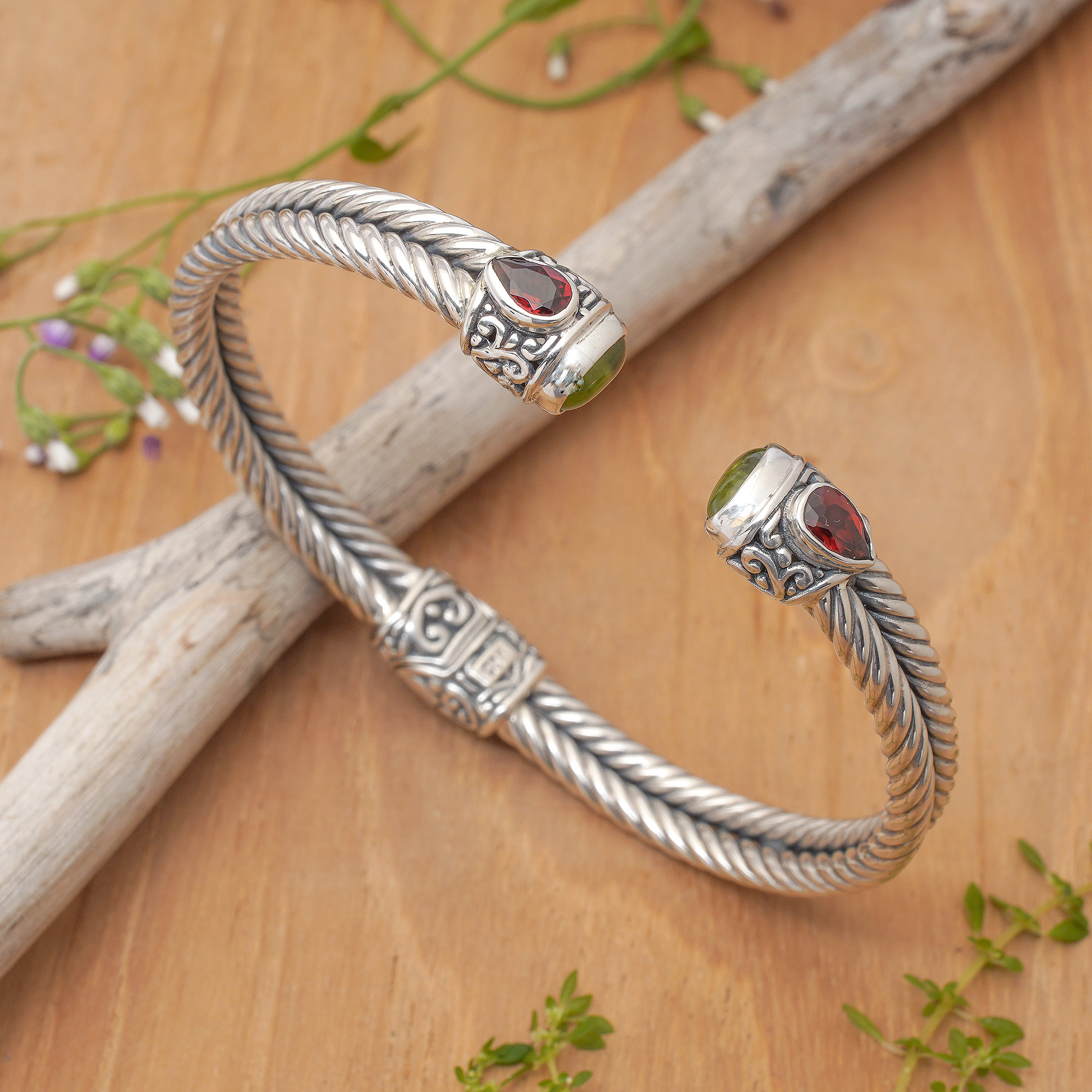 Generations of Balinese tradition inspire this elegant design by Wayan Neri. Crafted by hand, the cuff bracelet features spiral patterns and is hinged at the center for easy fit. Ornate tendrils swirl in arabesques at each, where amethyst, garnet, citrine and peridot totaling 2.48 carats nestle amid tiny silver granules.