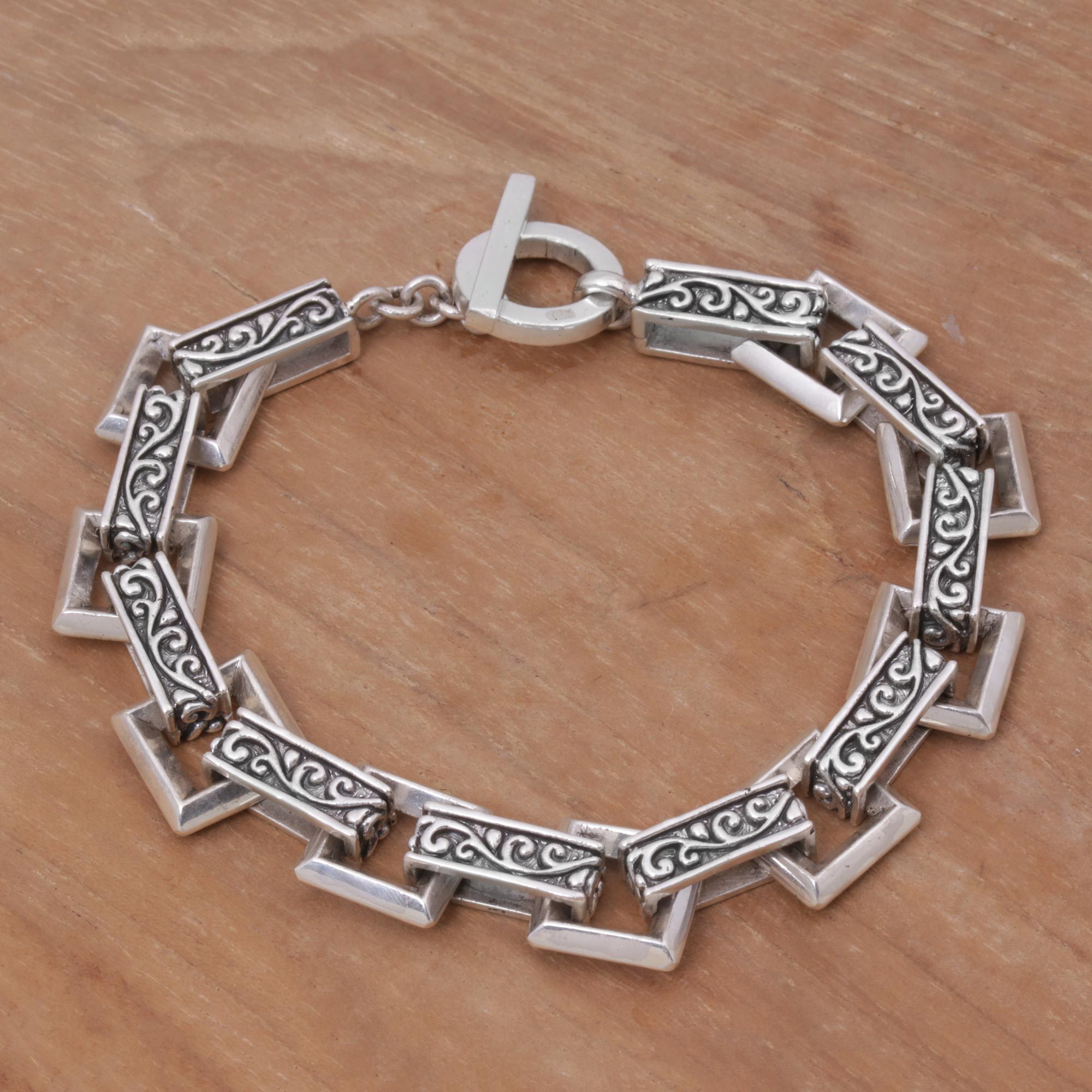 Bold links of sterling silver grace the wrist in this handcrafted bracelet, making an excellent accessory for both men and women. From Wayan Asmana, the links are adorned with mesmerizing Balinese spiral motifs.