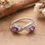 Two deep purple amethyst gemstones are beautifully complemented by a sweeping band of cubic zirconia that curves in an infinity symbol-like pattern, representing timeless elegance and continuity. This sterling silver cocktail ring features pear-shaped amethysts set on either end of the band, creating a graceful and balanced design. The contrast between the rich violet hues of the amethyst and the sparkling brilliance of cubic zirconia gives the ring a refined yet contemporary charm. Presented by India's Chintan, it is a perfect statement of sophistication either for casual or evening wear.