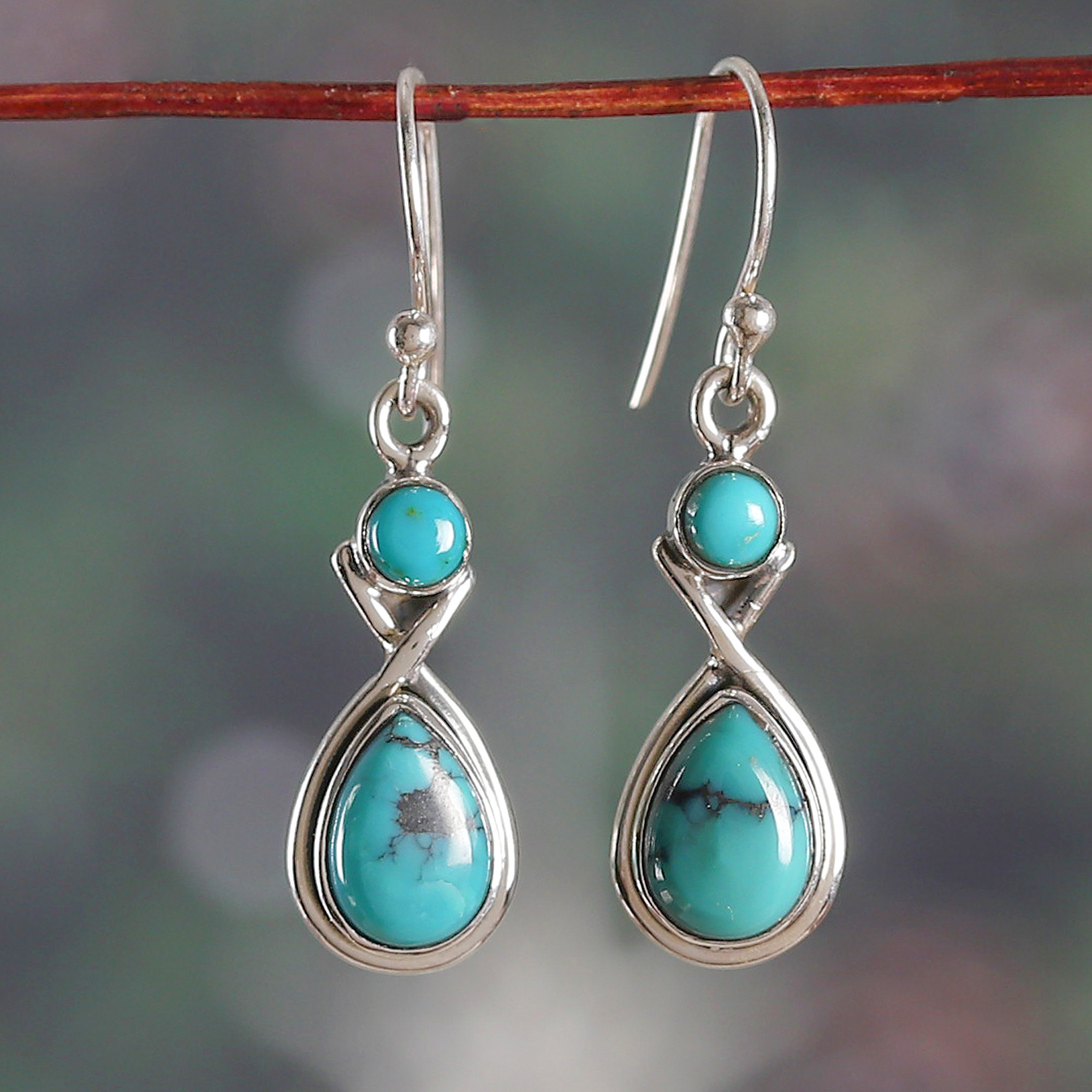 Experience an eternity of refreshing sensations with these dangle earrings by India's Shivani Choudhary. The designer uses sterling silver—in polished and oxidized finishes—to craft the infinity-shaped pair, and then she crowns the pieces with reconstituted turquoise cabochons that evoke the colors of a tranquil lagoon.