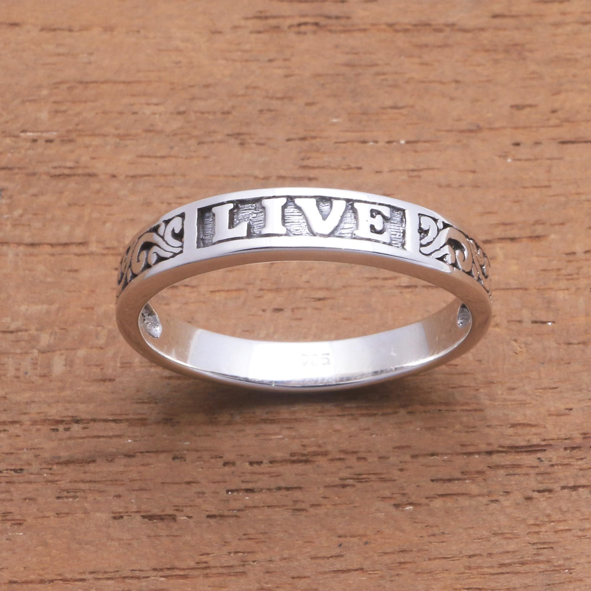 Making an inspirational accessory wherever it goes, this band ring is designed by Balinese artisan Nyoman Rena. Intricate swirl patterns in sterling silver circle the finger, centered by the word "Live." A combination of finishes completes this ring.