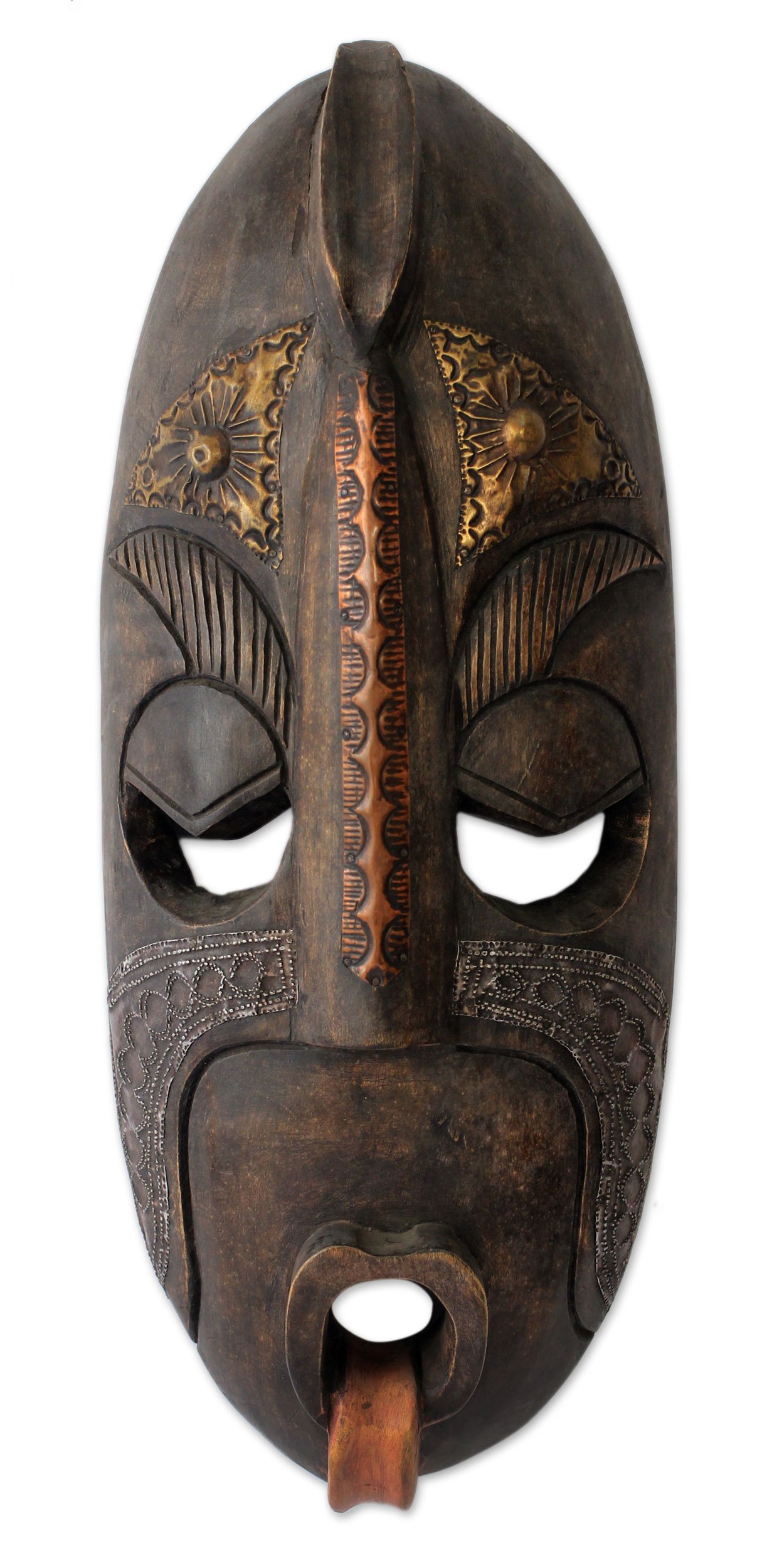 This mask, skillfully hewn by Robert Nortey and the artisans of Robanty Limited, symbolizes courage. Rendered in the style of the Baoule people of Cote d'ivoire, the face suggests an ancient warrior, who fought persistently to revenge the death of others despite having shed his own blood. His tongue hangs out in an expression of bright red, representing the sufferings of his people. Brass plates adorn the nose, cheeks, and forehead, complementing the rich grain of hand-carved sese wood, finished in dark tan and black polish.