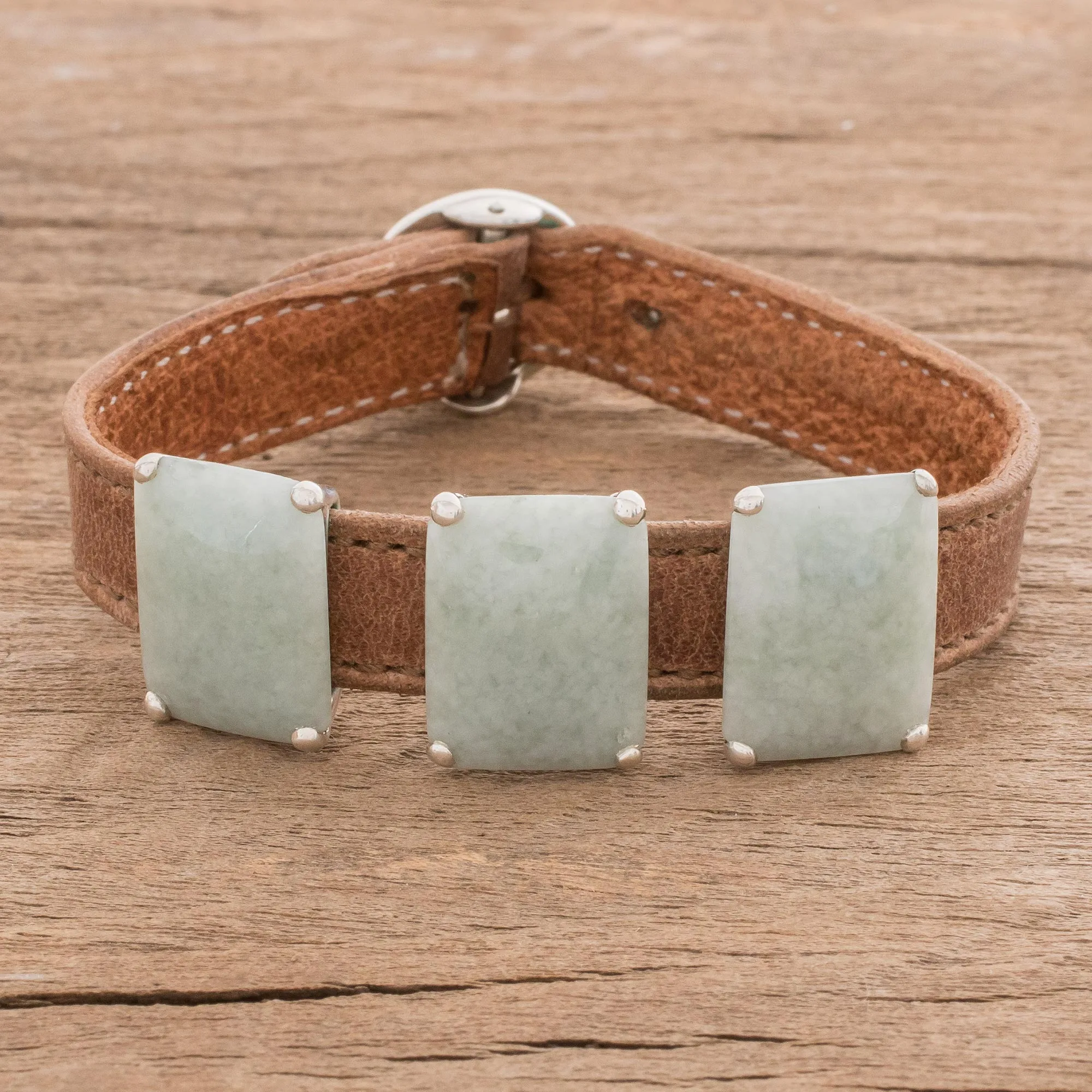 Circling the wrist with an adjustable leather wristband, this bracelet is designed by Guatemala's Nicte Migliozzi. She chooses three rectangular cabochons of jade in verde manzano, or "apple green," that form a pendant at the center. Sterling silver bezels and a buckle clasp complete the beautiful bracelet.