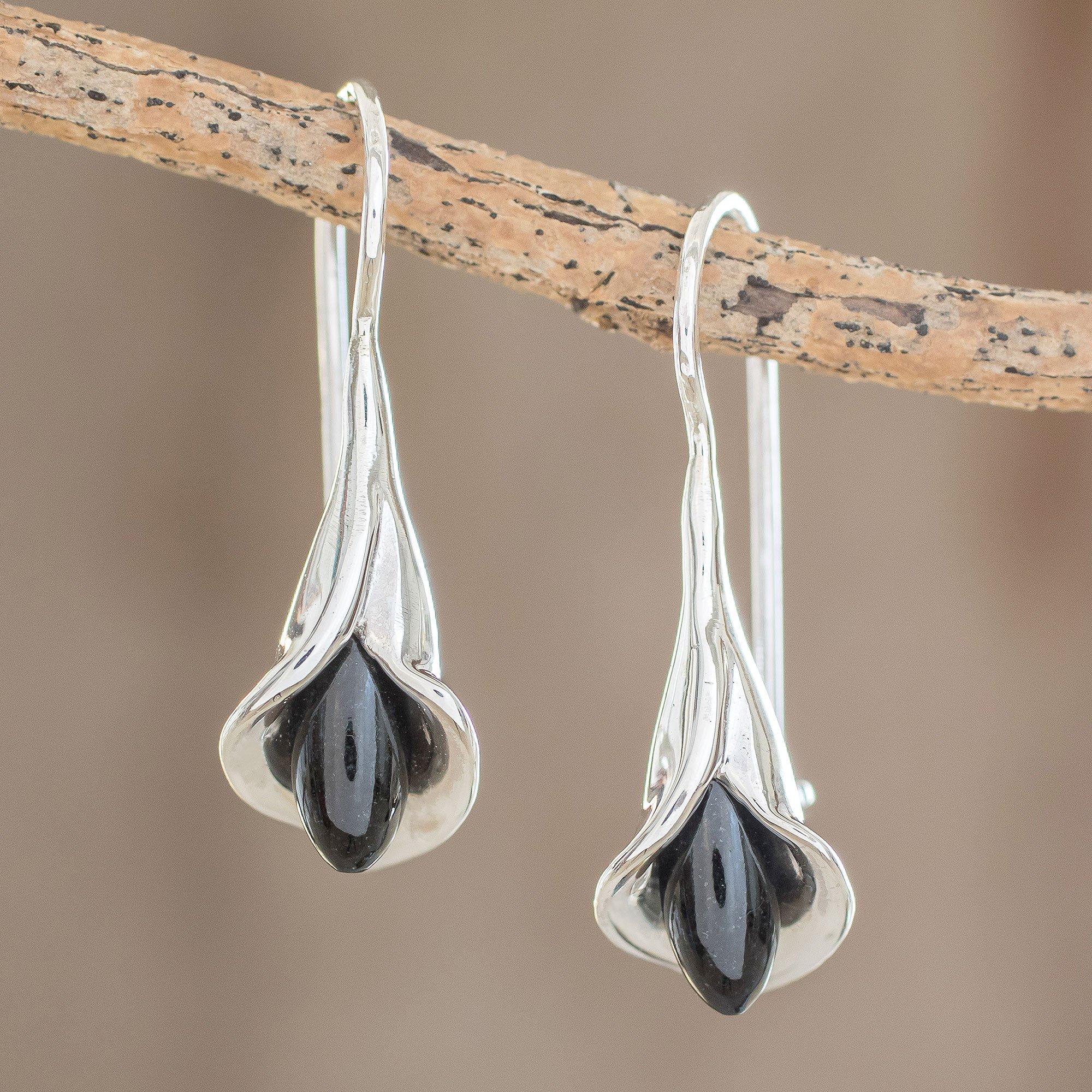 Cradling teardrops of natural black jade, two arum lily flowers are crafted of sterling silver in this pair of drop earrings from Guatemala. Inspired by the beauty of nature, Nicte Migliozzi designs and crafts these earrings.