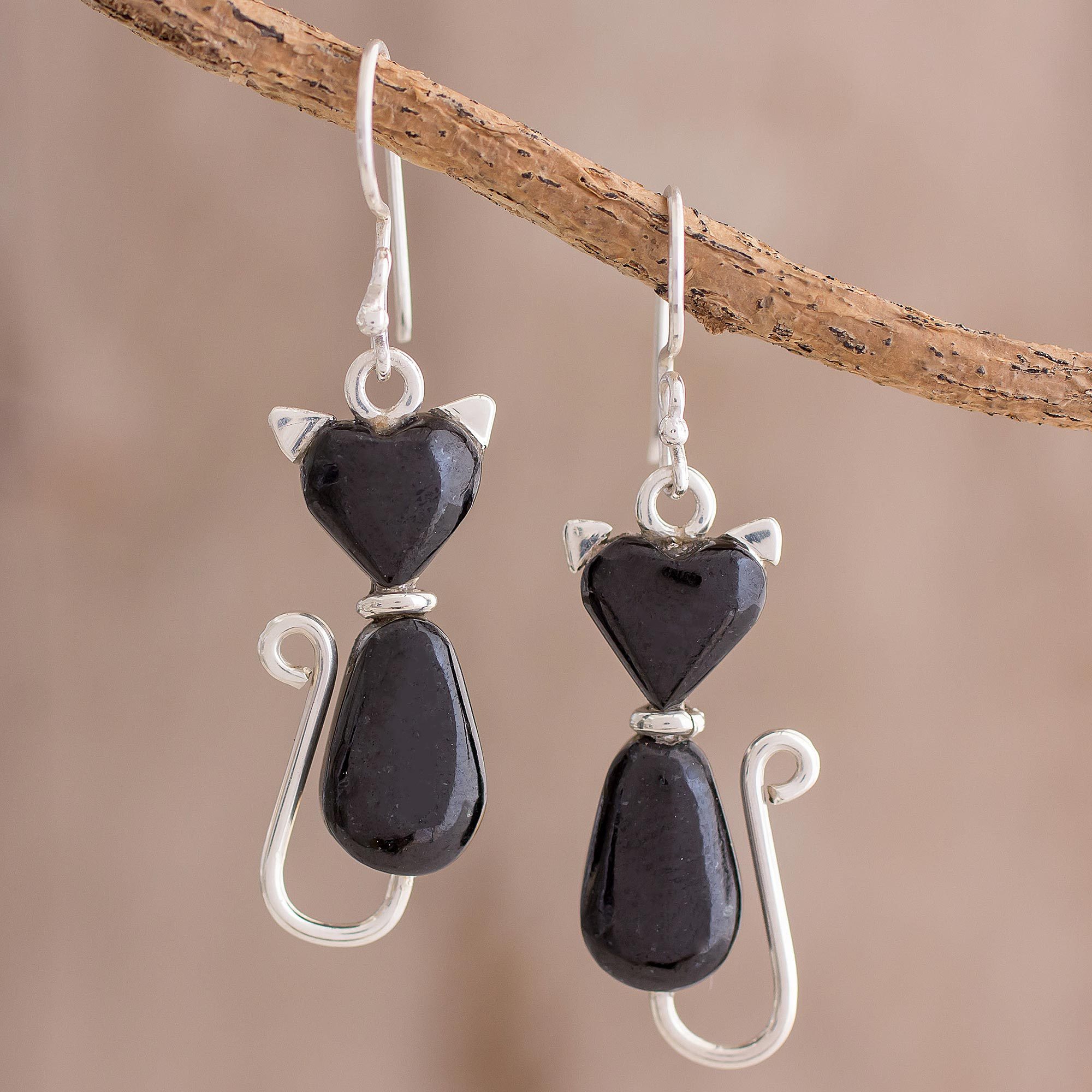 Jade Cat Dangle Earrings in Black from Guatemala, 'Cats of Love in Black'