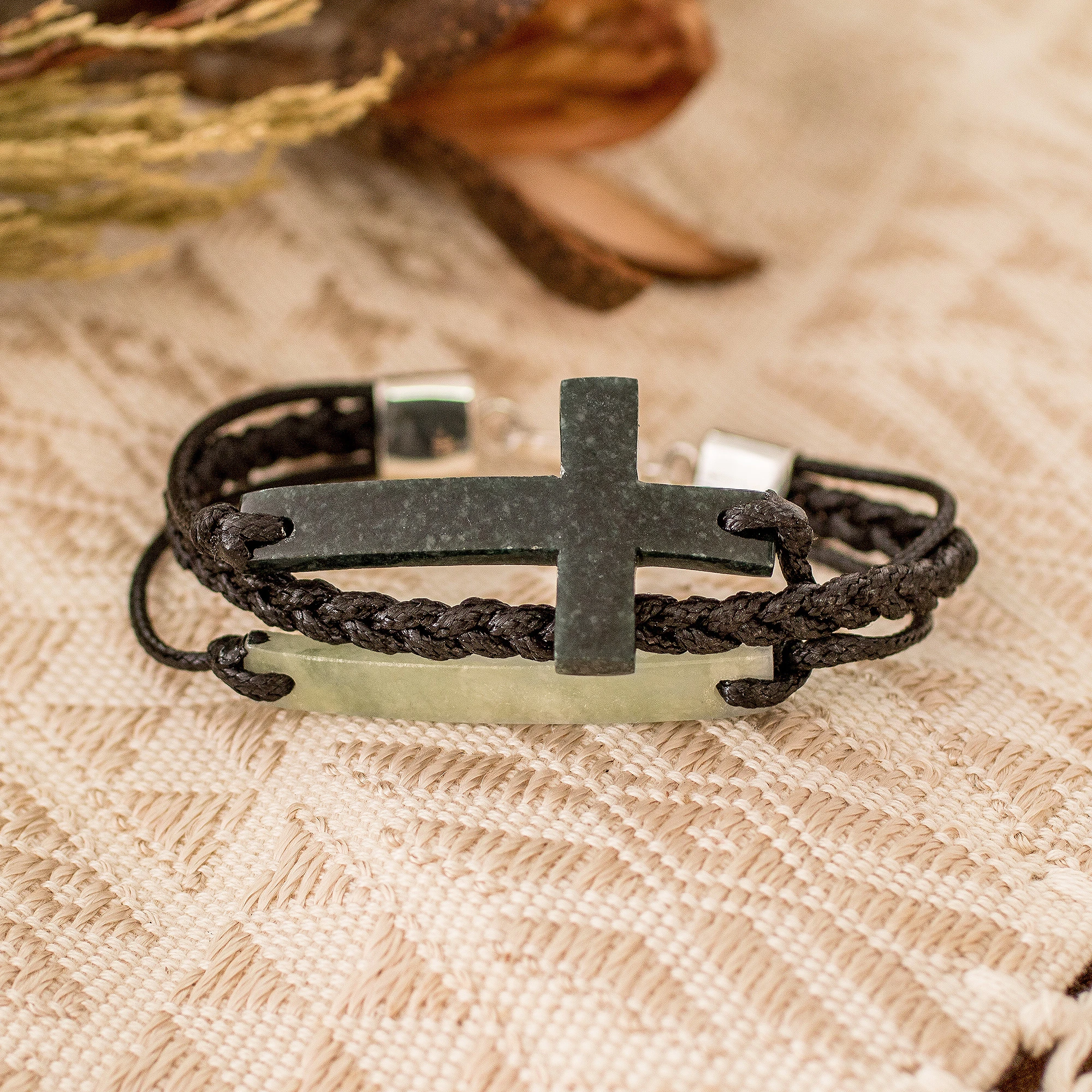 A religious cross of dark green jade combines with a simple light green pendant, centering this heavenly bracelet from Guatemala. Designed by Ruben and Gilda Perez, the bracelet circles the wrist with cotton cord, completed with an adjustable sterling silver clasp.