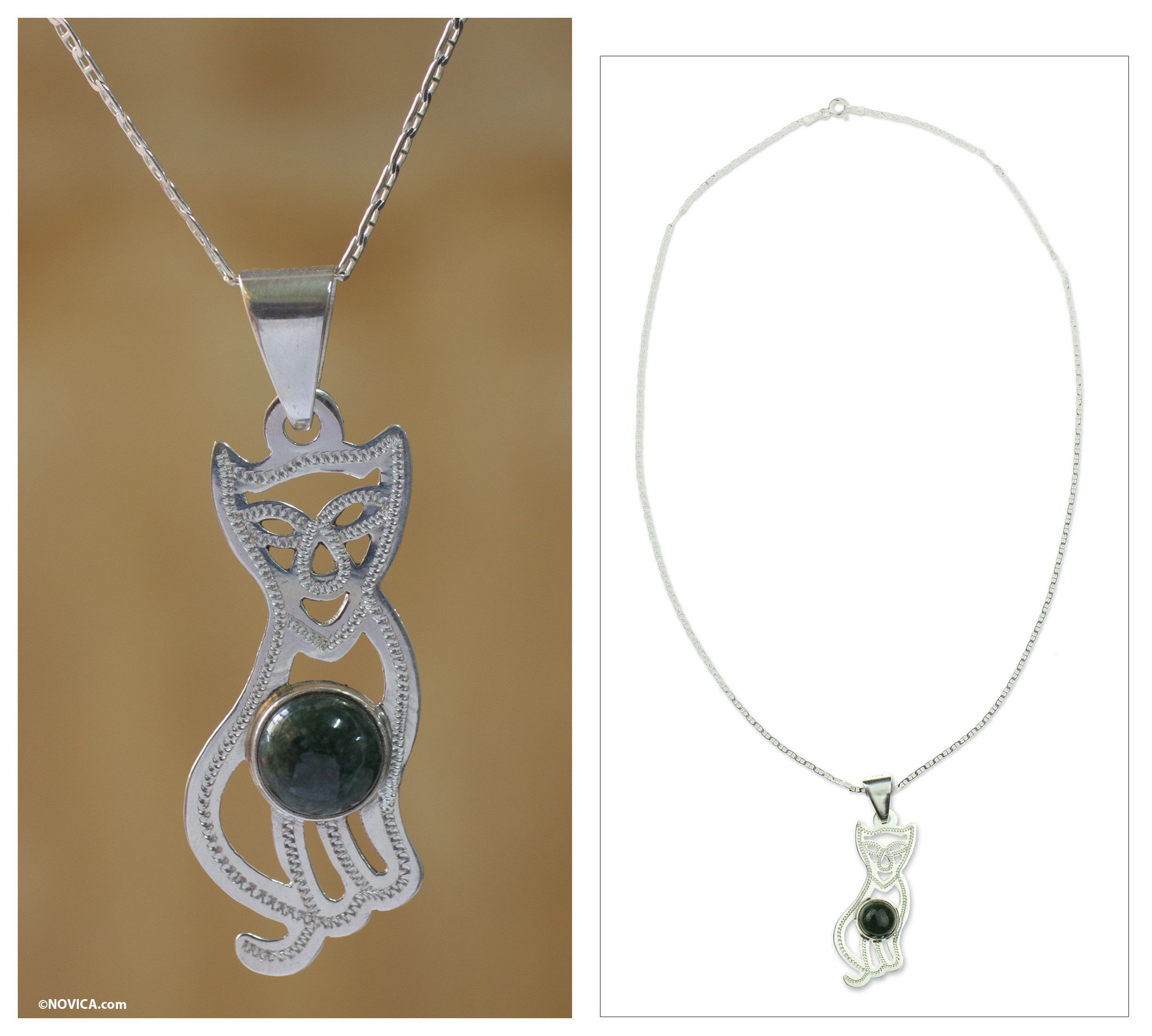 Relative of the mystic jaguar, a cat embraces a sacred green gem. Known as ya'ax chich, Guatemalan jade has been prized since pre-Hispanic times. It finds the perfect complement in a sterling silver necklace by Zandra Lorena Sajbin.