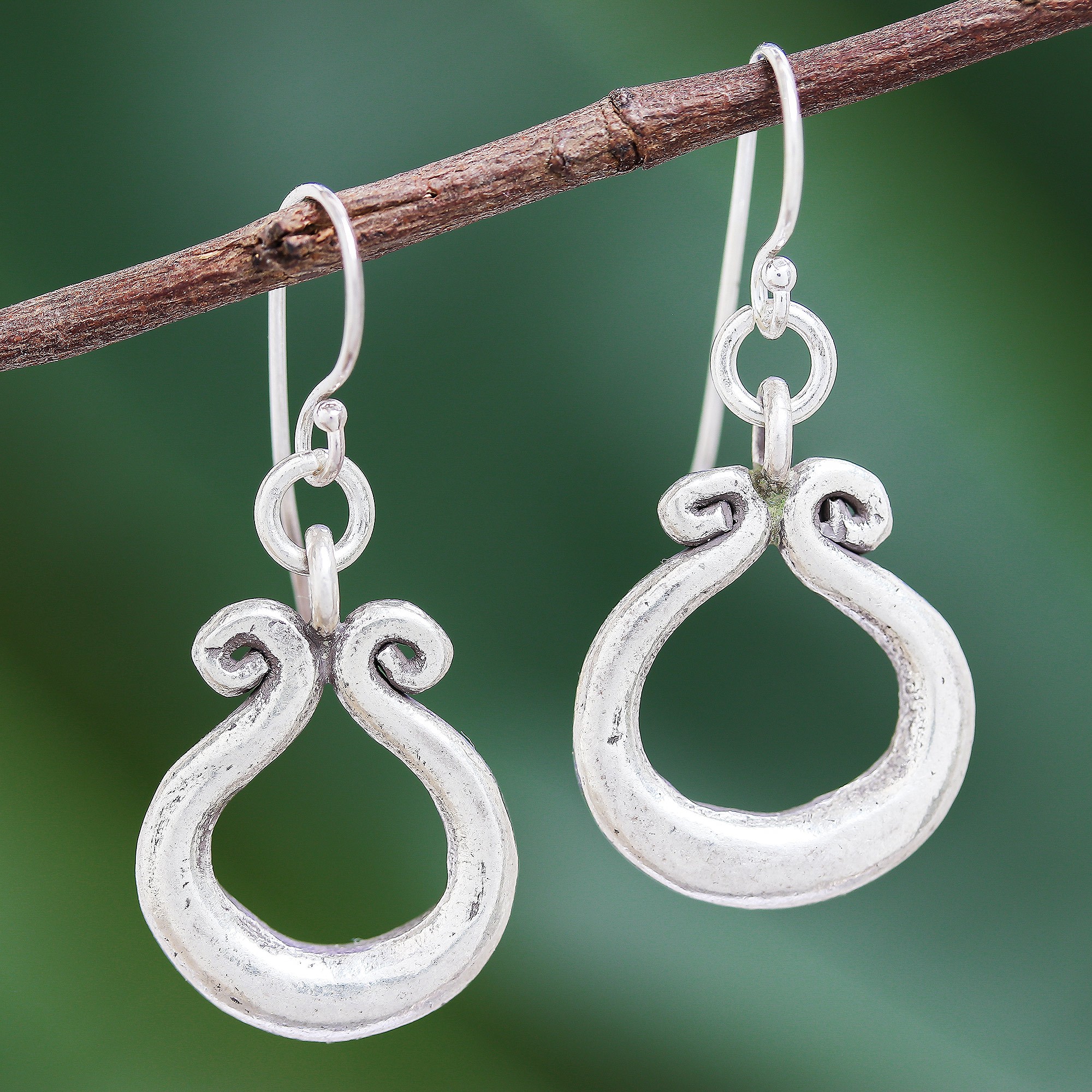 In this pair of dangle earrings, ribbons of Karen hill tribe 950 silver are curved to create an organic-shaped circle with a flourish where the circle joins at the top. Designed by Sasithon Saisuk of Thailand, the earrings are artfully oxidized to highlight the top scrolls. The earrings hang from silver hooks.