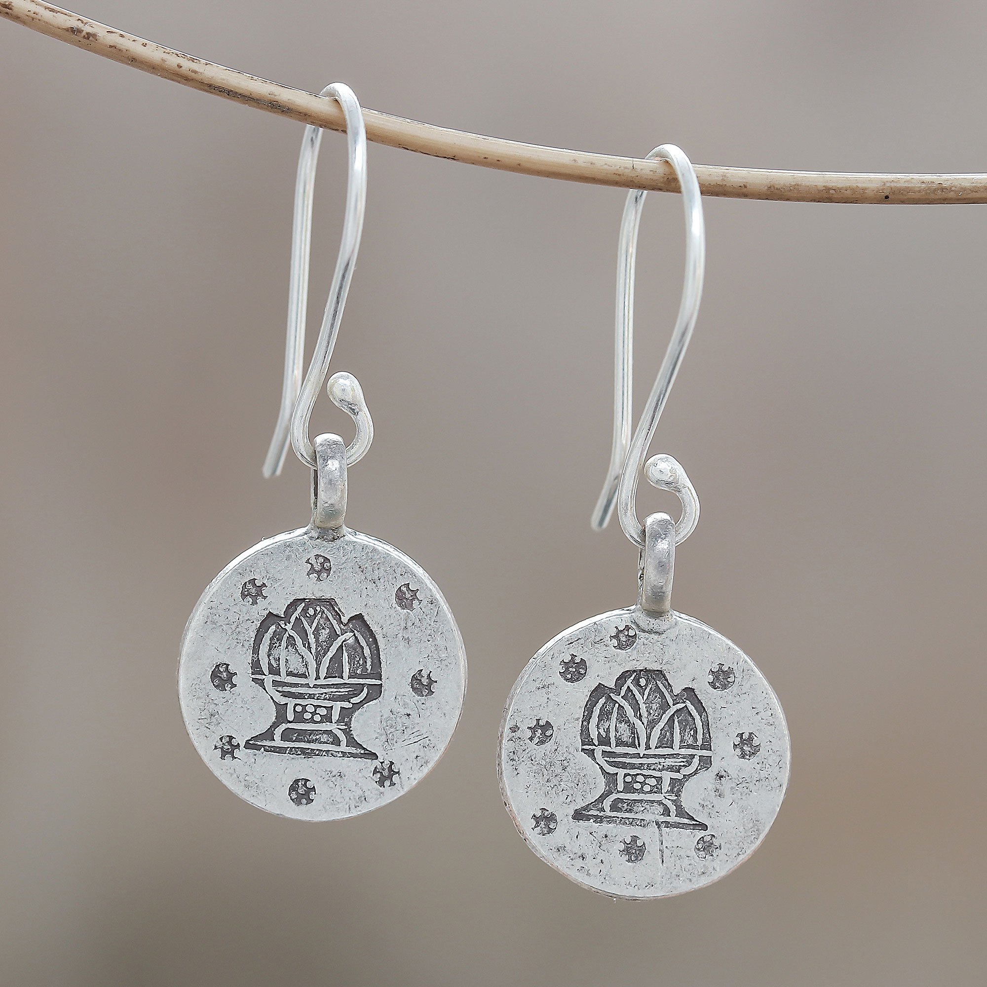 Represented by a vessel of water, Aquarius is a zodiac sign that occurs between January 20th and February 18th. Thailand's Chanatip Na Lampoon offers these dangle earrings for the Aquarius in your life. Each medallion-shaped earring is handcrafted from Karen hill tribe silver with an oxidized Aquarius stamp.