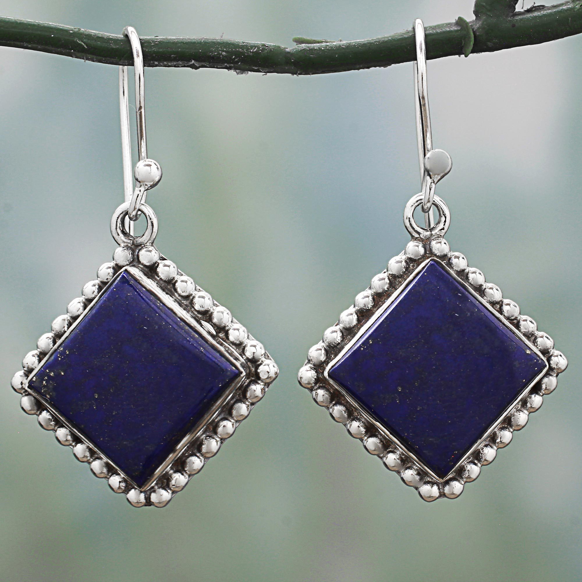 Lapis lazuli gemstones are surrounded by intricate sterling silver work in these dangle earrings presented by Indian artisan Neeru Goel. Traditionally, lapis lazuli is thought to relieve negative thoughts and enhance psychic abilities, intuition, and channeling.
