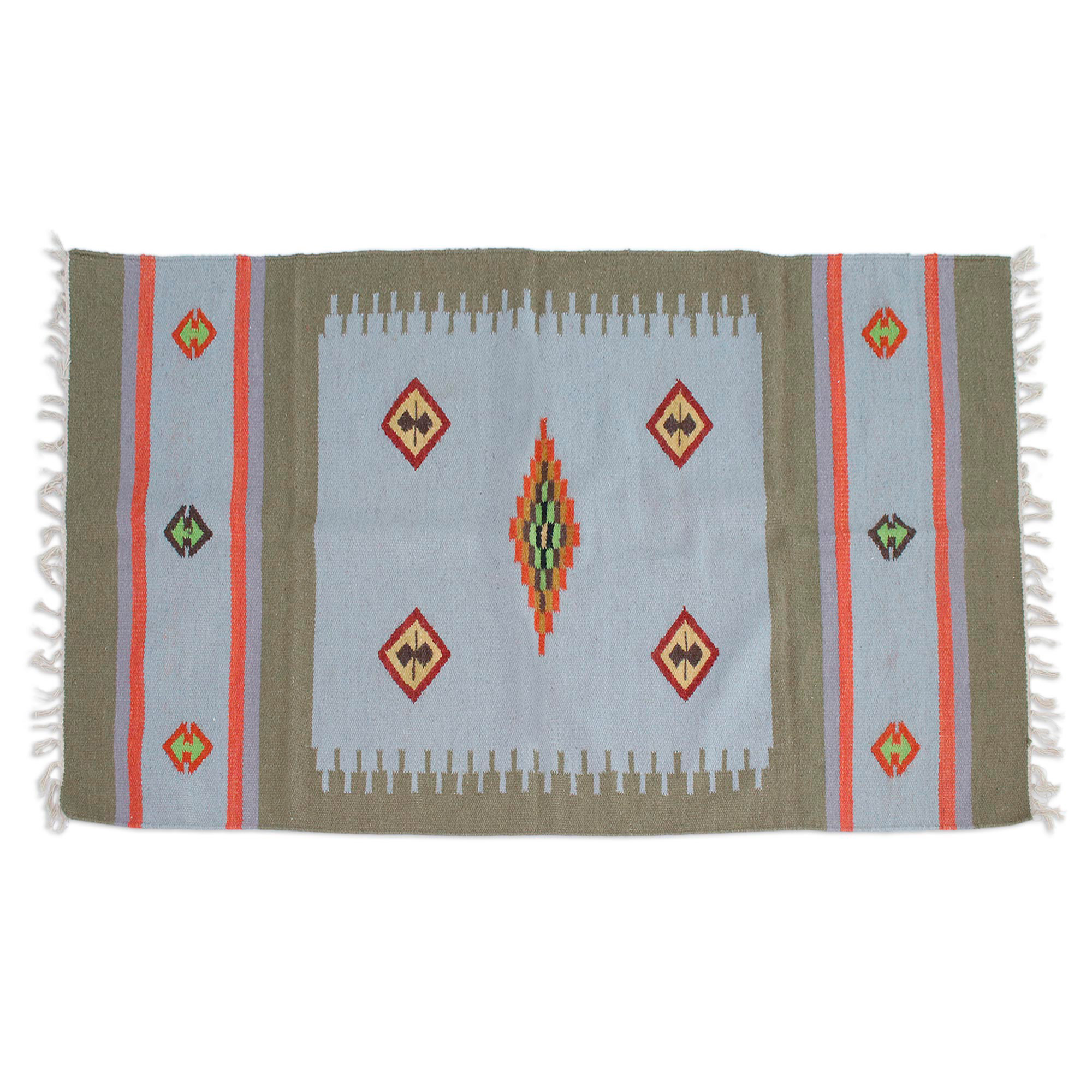 Welcome to the joyful home that Sonik Sethi's dhurrie rug builds with carefully selected details. A palette of kiwi, orange and sky blue hues takes over this fringed piece, handwoven with wool yarns and accented with a traditional diamond pattern.