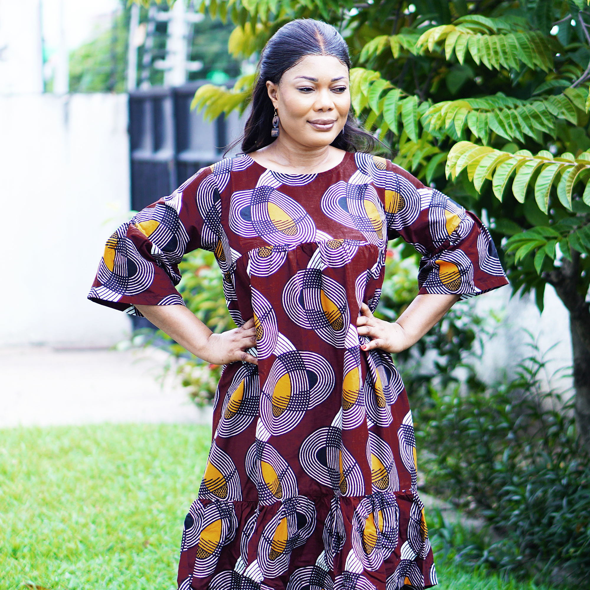 This brightly colored and boldly patterned dress is the original design of Ghana's Lydia Mawuenya Amedzrator. Crafted from 100% cotton in shades of copper, brown, and black, the dress features short flared sleeves, a round neck, and full skirt that hits at the knee. The back has a buttoned keyhole closure.