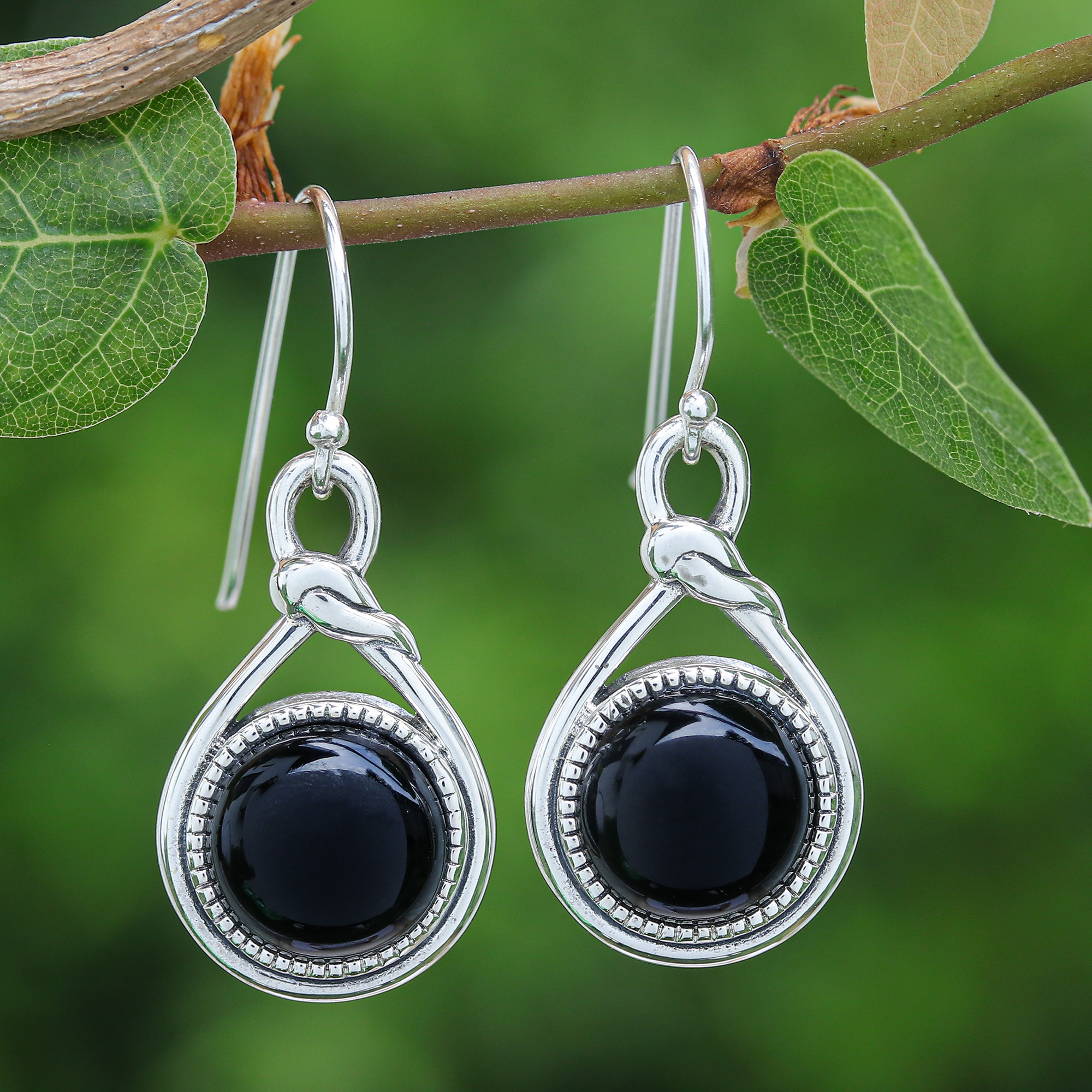 Knot Pattern Black Onyx Dangle Earrings from Thailand, 'Enigmatic Knot'