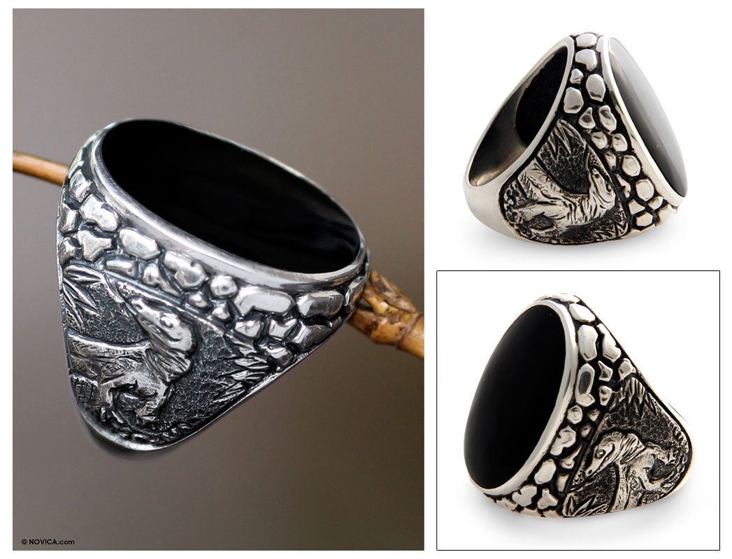 The legend of the komodo dragon is celebrated in the intricate design of this handsome ring. Created by Jenny Setiawan from Indonesia, the bold work of art features a water buffalo horn as the crowning center, with the mighty lizard worked in .925 sterling silver. You'll be reminded of the power and strength the of ancient legend when you wear this fascinating creation.