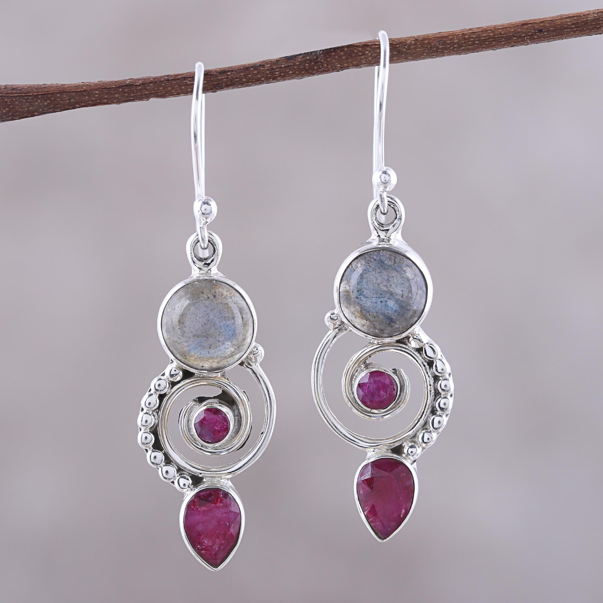 Sterling silver dots travel a spiral labyrinth between a round labradorite stone and a tear drop of agate in this gorgeous pair of dangle earrings. A round, faceted agate rests in the center. Presented by Neeru Goel of India, these handcrafted earrings hang from sterling silver hooks.