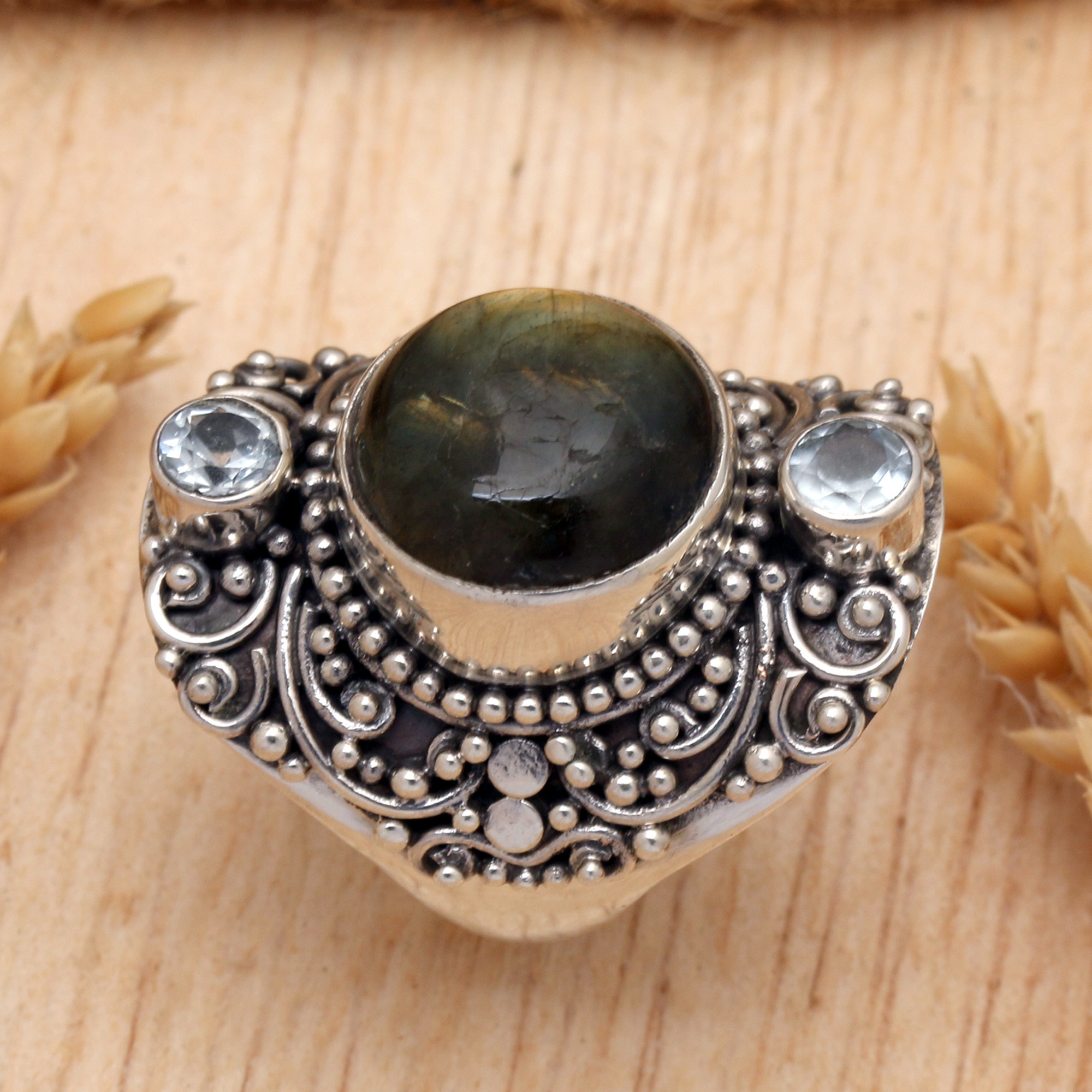 An intricate band is handcrafted of sterling silver, featuring spiral and bubble motifs that decorate the front part. A combination of contrasting finishes cause the designs to really stand out, framing a round cabochon of natural labradorite that is flanked by two petite blue topaz stones. This cocktail ring by Balinese artisan Buana makes a soulful companion wherever it goes.