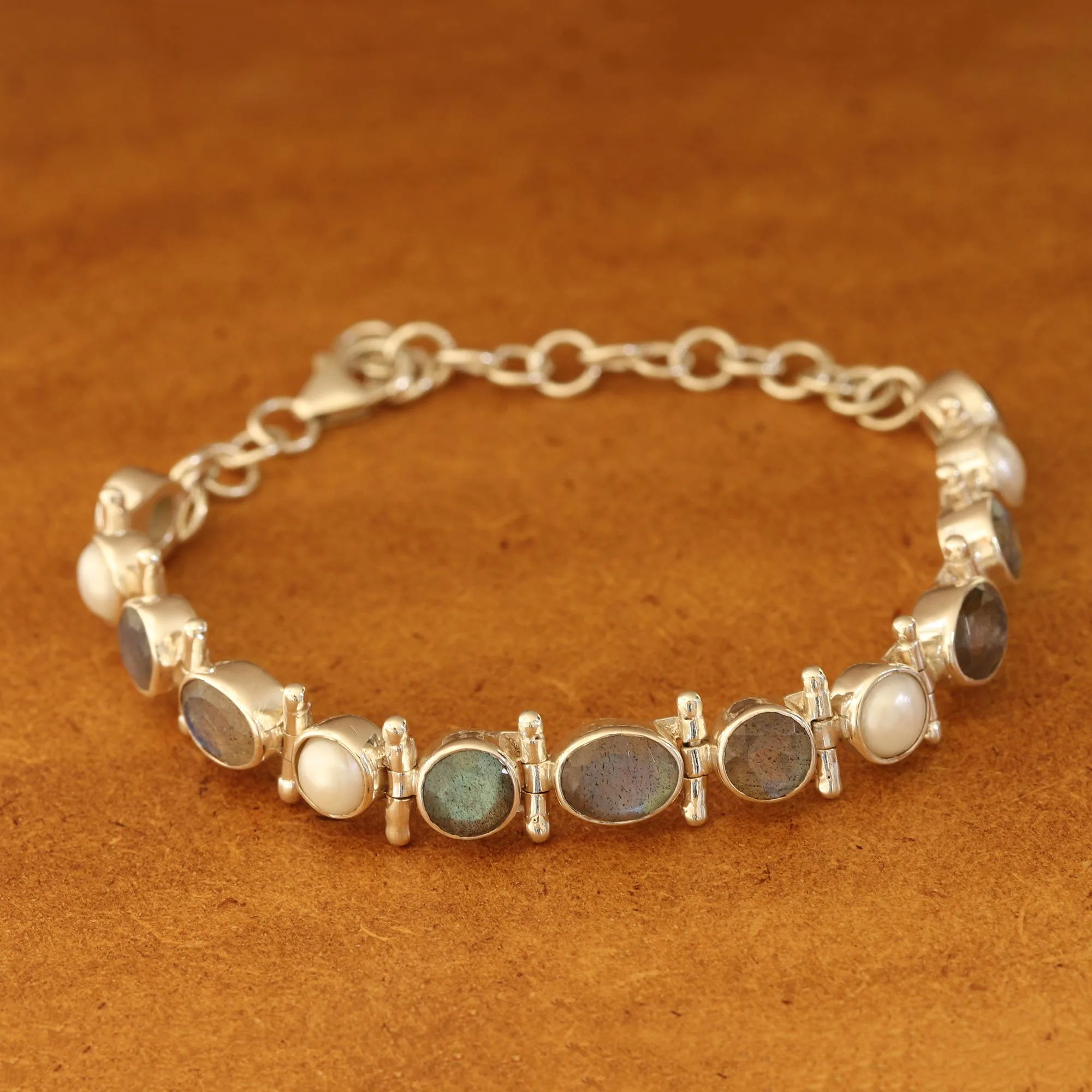 Purely charming, this stunningly beautiful bracelet from India is designed by Neetu Barathi. A trio of labradorite gemstones is flanked by alternating cultured pearls and labradorite gems, framed by high-polish links of sterling silver.