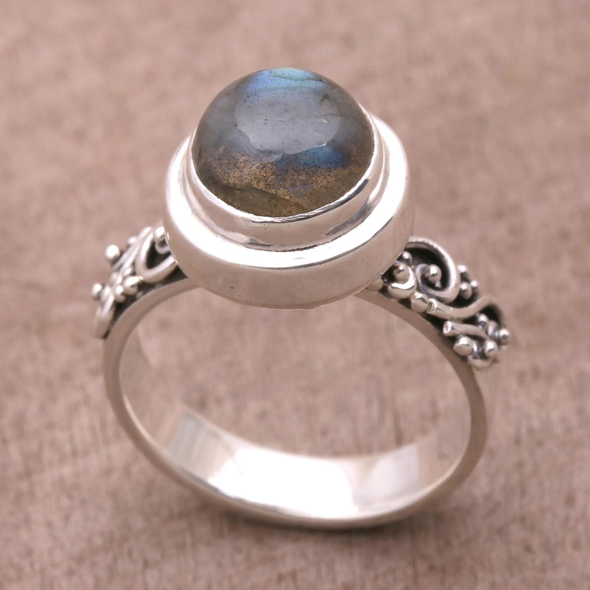 Designed by Balinese artisan Buana, this cocktail ring is crowned with a single stone of natural labradorite. Sleek sterling silver with a high-polish finish frames the stone atop a band accented with handcrafted spiral and bubble motifs for an exquisite companion.