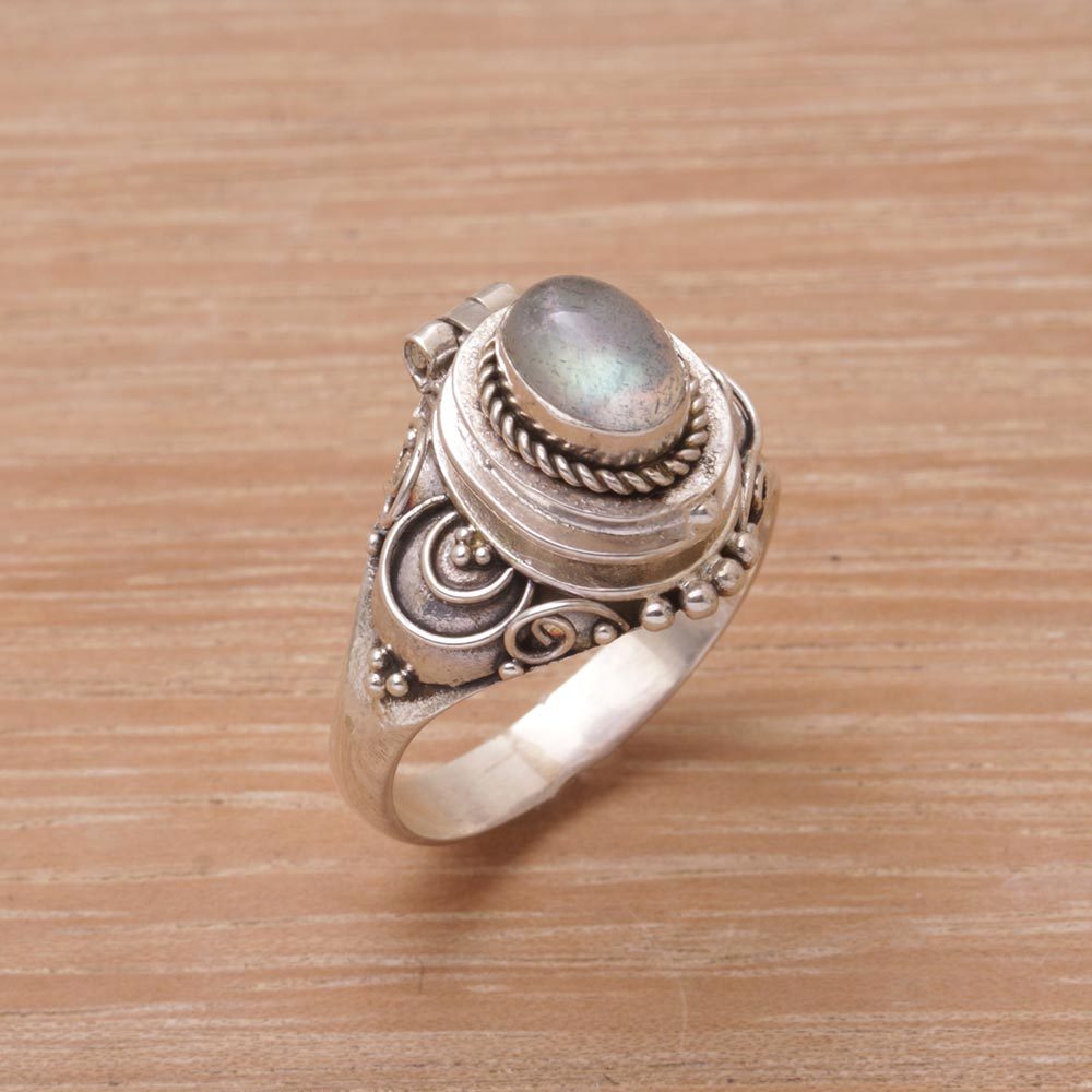 Shimmering sterling silver is handcrafted into this elegant ring from Bali. It features an oval stone of natural labradorite at the top with a locket that opens to safeguard small keepsakes and photos. Sukartini presents this lavish accessory.
