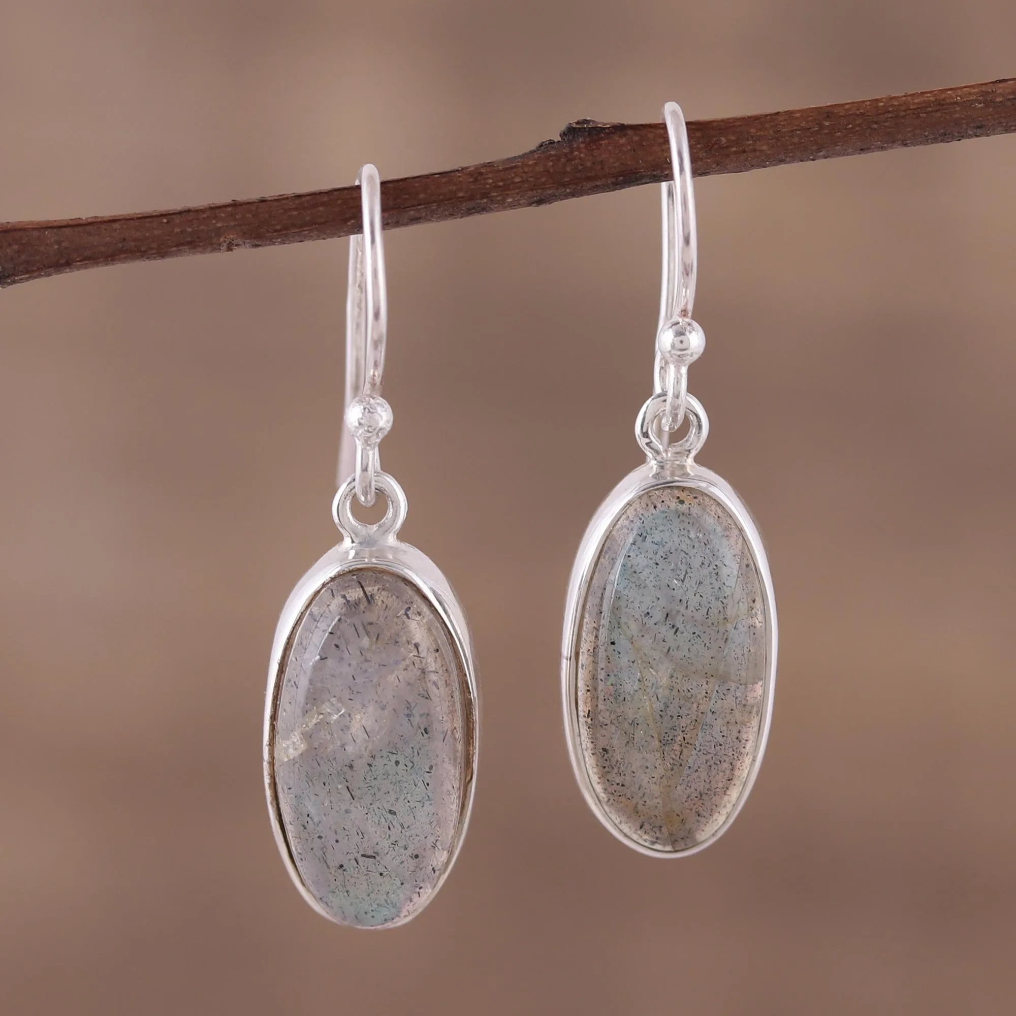 Classic oval bezels hold gemstones that are anything but ordinary in these earrings from Neetu Barathi. The Indian artisan chooses labradorite for her design, an intriguing stone with a shimmering play of color that is in fact known as "labradorescence". Inuit lore claims that the stone is the frozen fire of the Aurora Borealis. The cabochon gems are set in polished sterling silver.