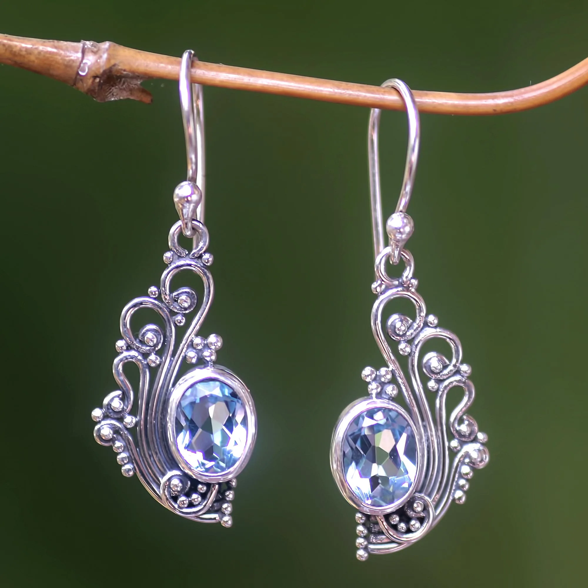 Lacy Blue Topaz and Silver Dangle Earrings from Bali, 'Blue Peacock's Feather'