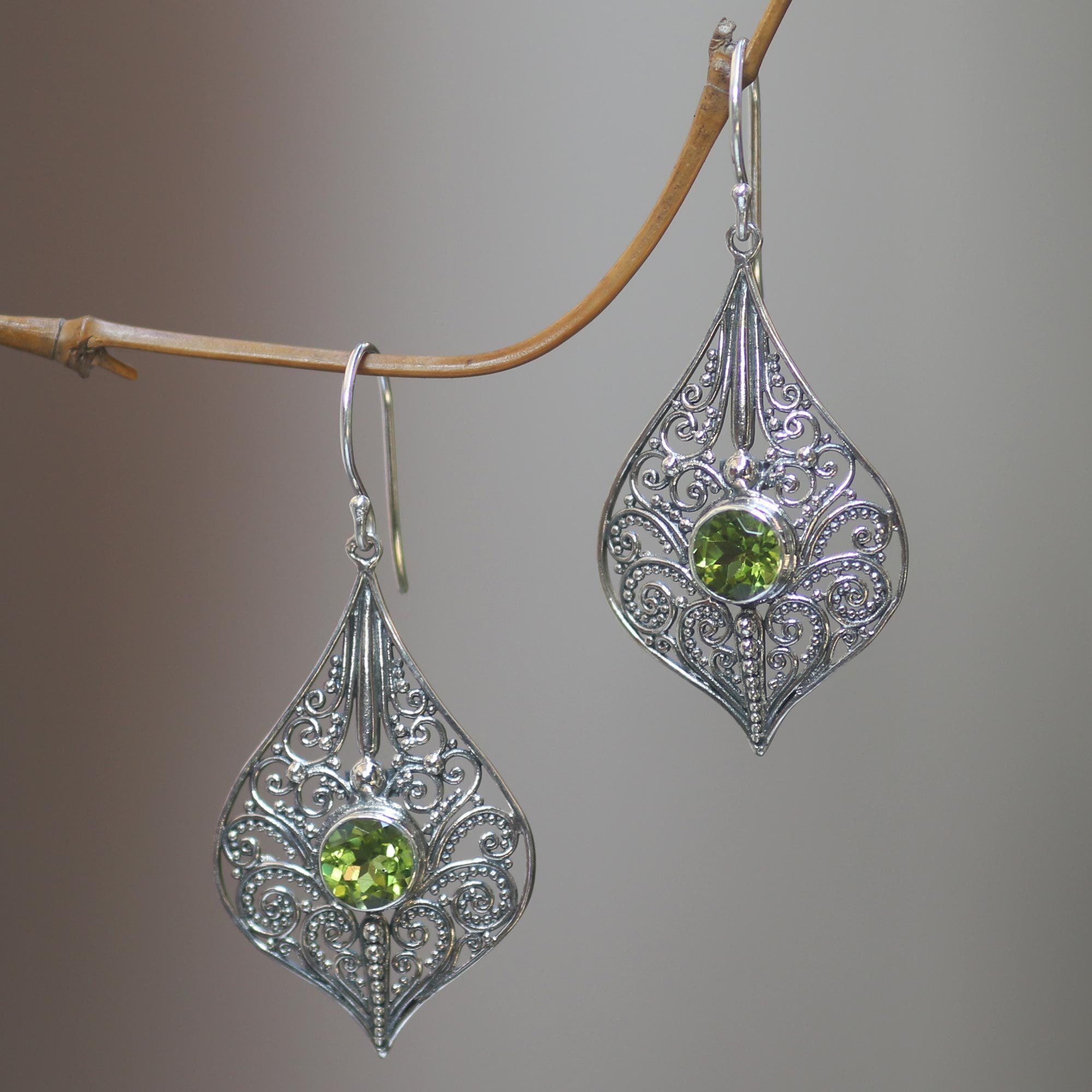 Lacy wire and beadwork in the traditional Balinese style forms a pretty background for verdant gemstones. Komang Suastra of Bali crafts the dangle earrings from sterling silver and adds 2.5 carats of sparkling faceted peridot in this feminine design.