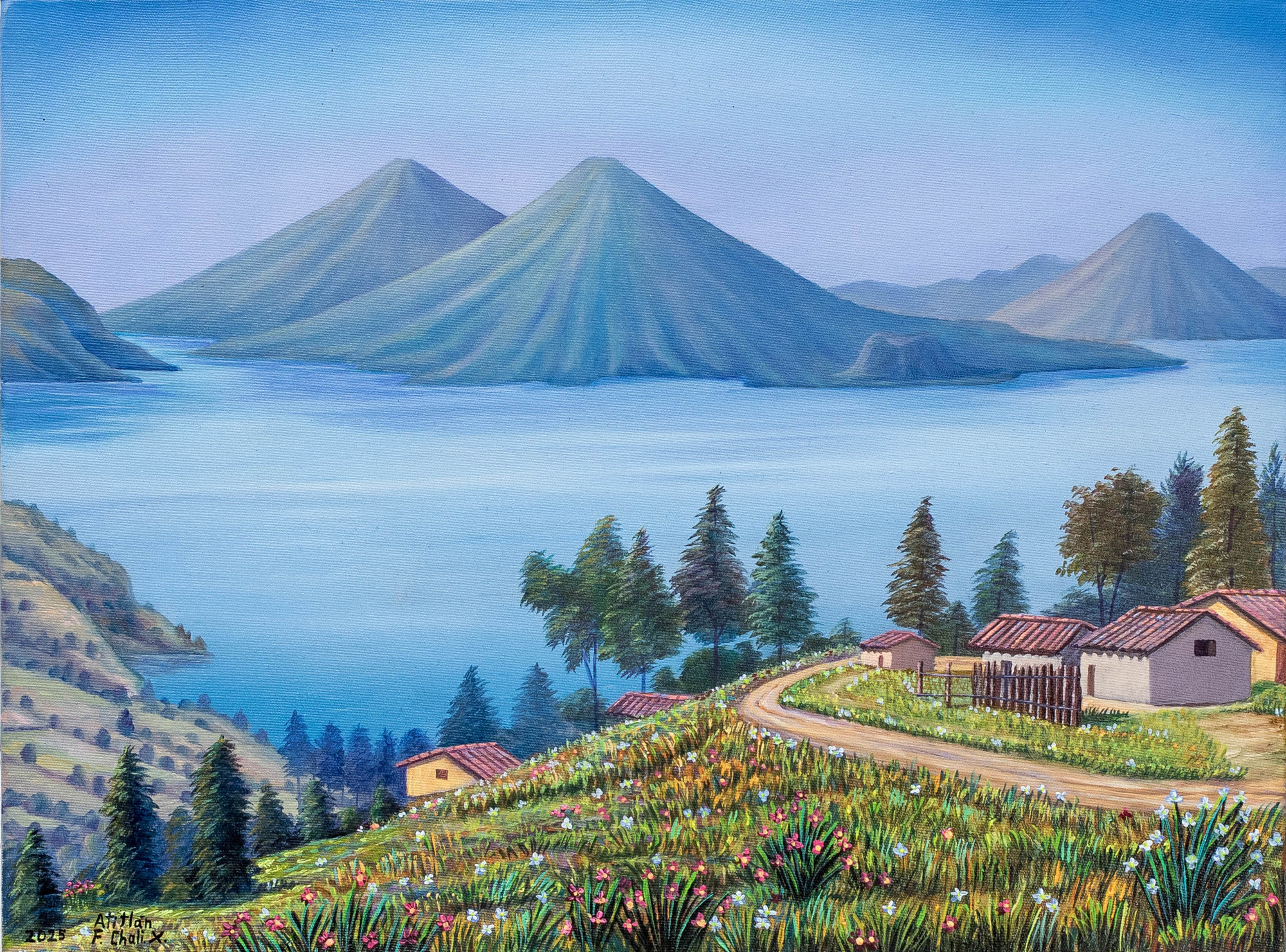 Immerse yourself in the captivating beauty of Lake Atitlán, Guatemala, through this exquisite oil painting rendered in a realist style. The dominant peaks of the Atitlan, Toliman and San Pedro La Laguna volcanoes command the horizon set against a dreamlike, cerulean sky that Filiberto Chali skillfully diffuses with soft whites, offering a spectacular vista. Gaze towards the lake's edge and discover a rustic road, winding its way to a lovely village. Detailed brushstrokes bring to life verdant crops, wild grasses, towering trees and a kaleidoscope of colorful flowers, all interspersed with charming, tile-roofed cottages peeking through the rich foliage.