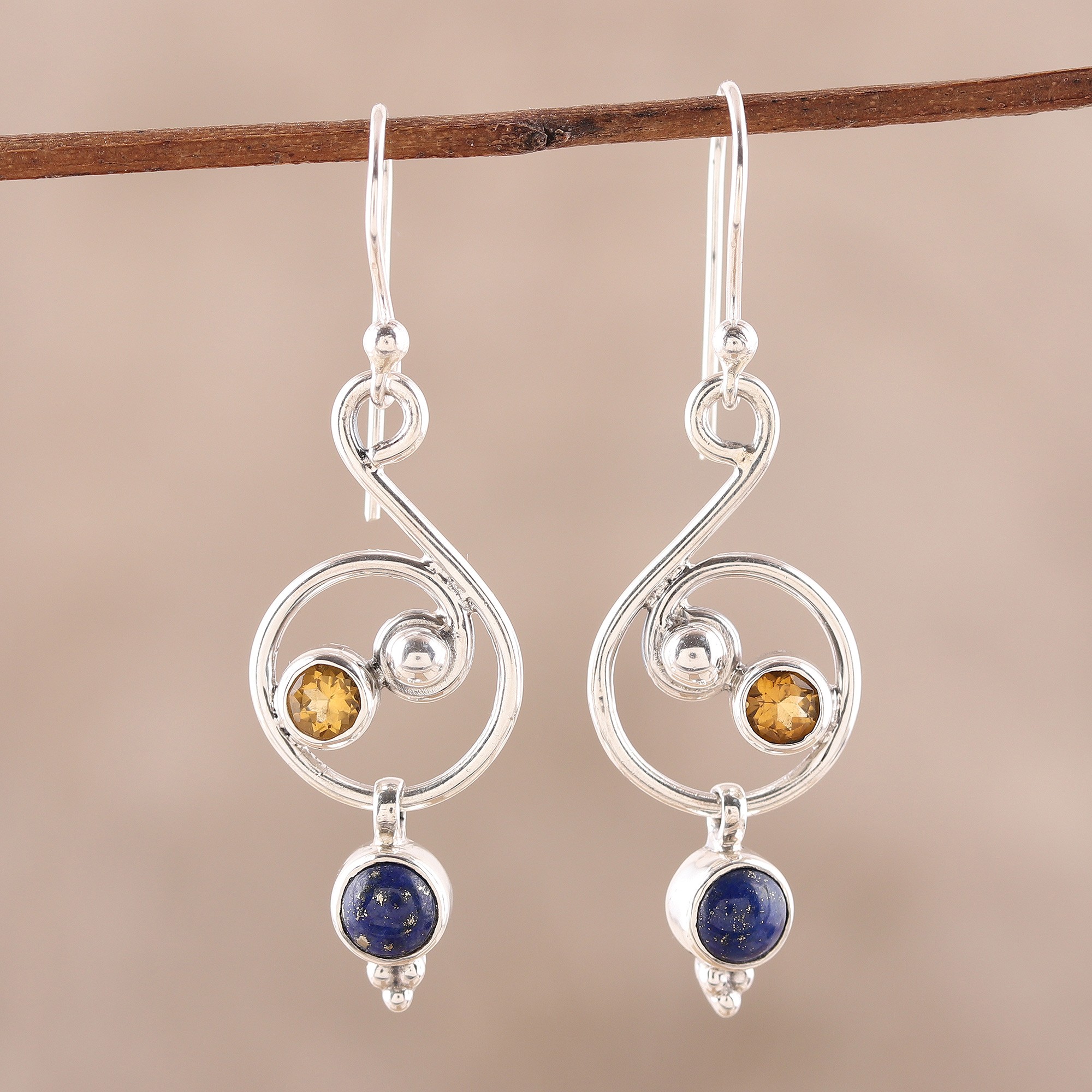 Lapis Lazuli and Citrine Earrings Crafted in India, 'Swirling Royal'
