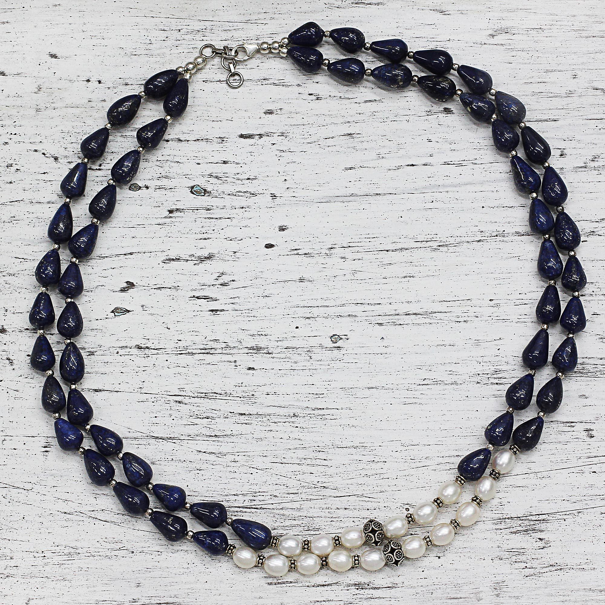 Lapis lazuli and white pearls come together in a beautiful alliance of elegance for the design of this necklace. From India's Narayannii, the two-strand necklace is crafted by hand featuring florid sterling silver accents.