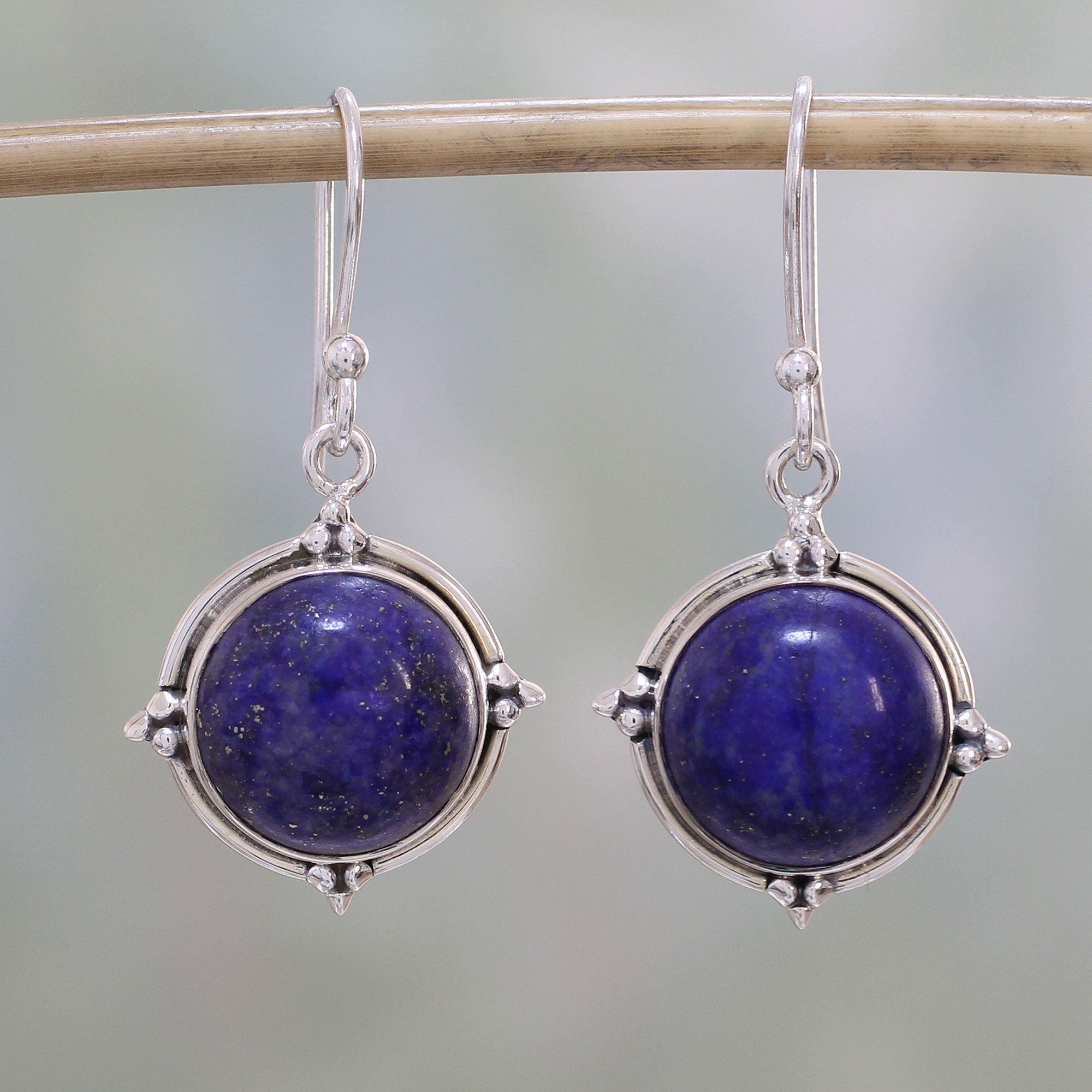 Two round stones of speckled blue lapis lazuli are framed by sterling silver with a distinguishing combination of finishes. India's Neeru Goel presents this pair of dangle earrings with pride, working with local artisans.