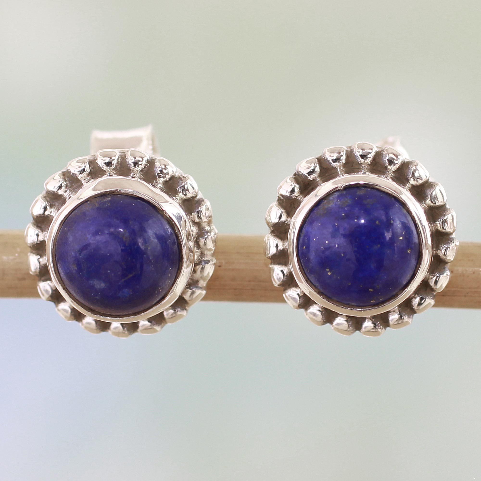 Round stones of blue lapis lazuli are surrounded by dainty coronas in this pair of stud earrings from India. Pursuing her childhood passion for jewelry and gemstones, Neeru Goel presents these earrings, giving them a handcrafted design from sterling silver.