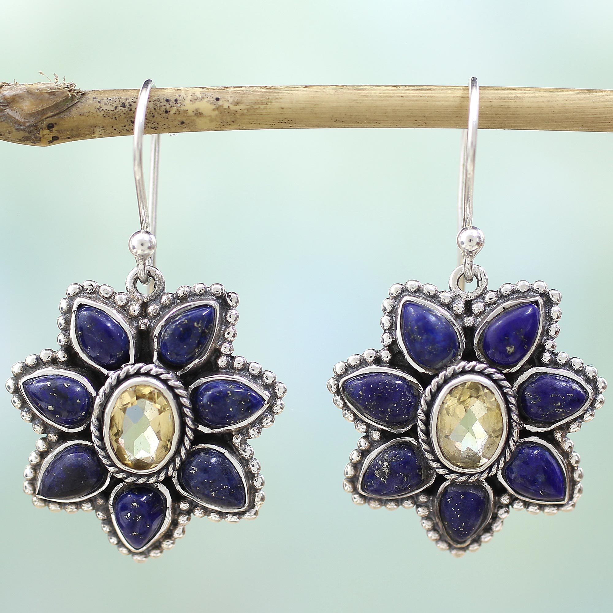 Lapis Lazuli Citrine Floral Dangle Earrings from India, 'Geranium Blossoms'