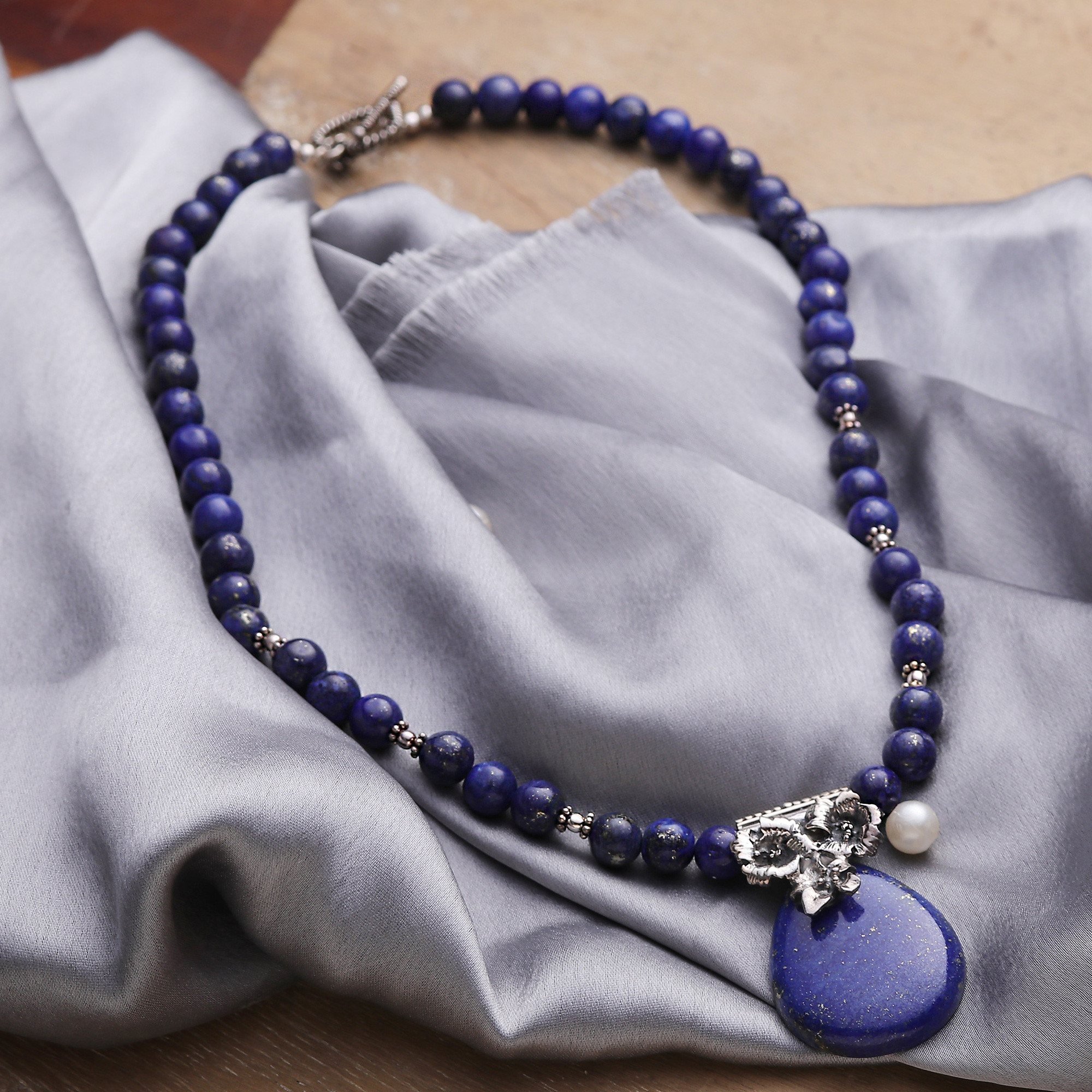Lapis Lazuli Necklace with Unique Silver Floral Accent, 'Jodhpur Moons'