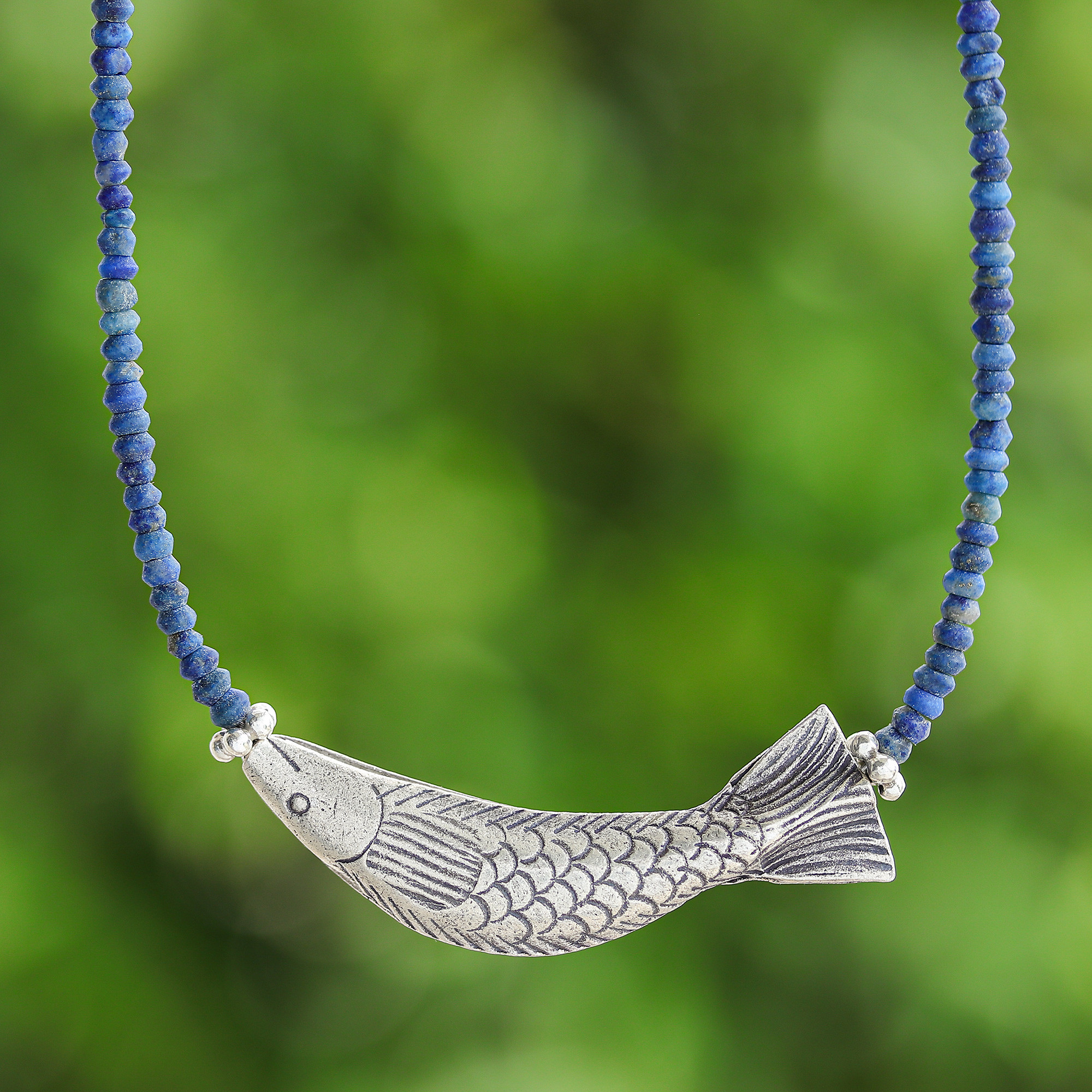 Thai artisan Sasithon Saisuk's sublime necklace bursts with personality, featuring vivid lapis lazuli beads that add a splash of electric blue to your wardrobe. The standout 950 silver pendant, shaped like a fish, brings a playful yet refined touch that sets your style apart.