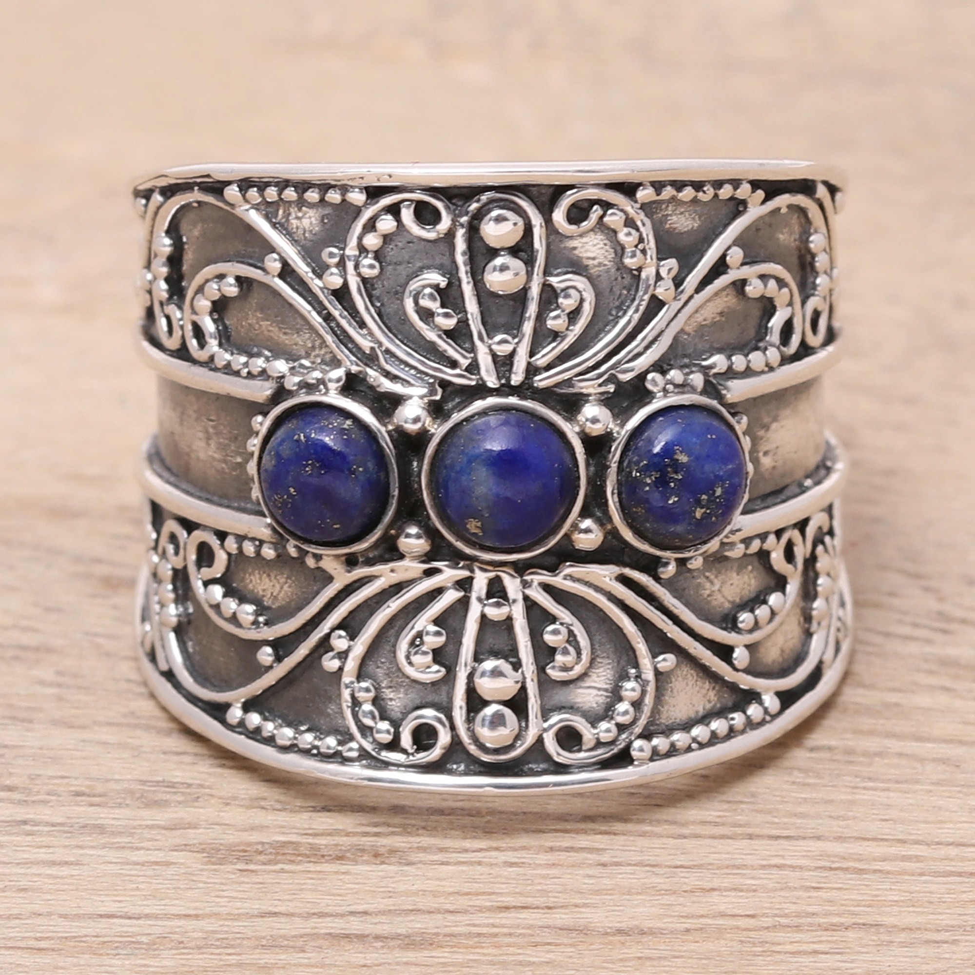 Crafted of sterling silver with an antique flair, this elegant cocktail ring is presented by India's Chintan. He works with local artisans, who complete the ring with a trio of lapis lazuli stones at the front.