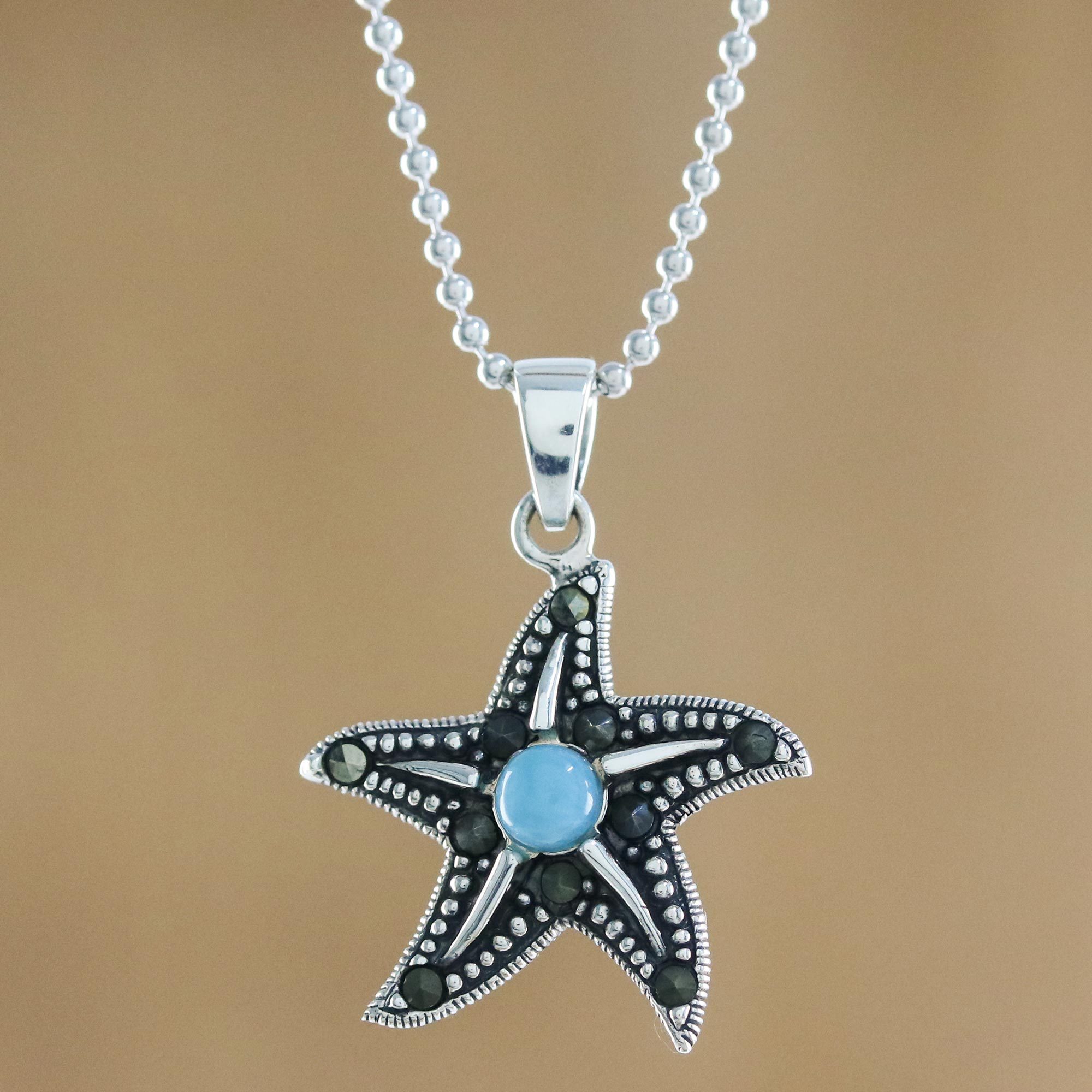 Larimar Marcasite Starfish Sterling Silver Pendant Necklace, 'Starfish at Night'