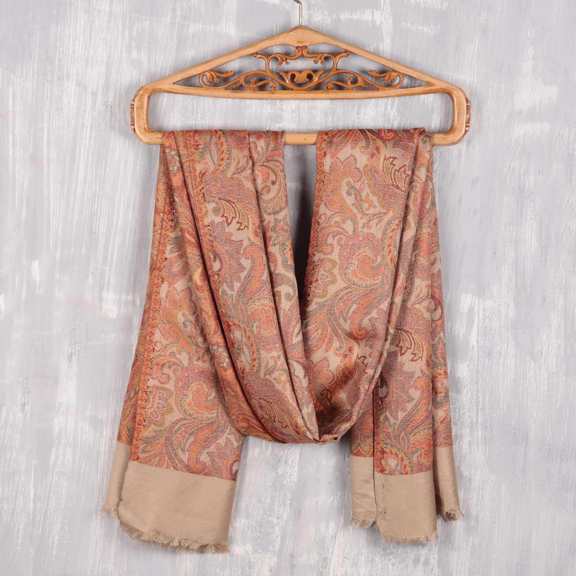 This reversible modal shawl from Sajad is hand woven on a traditional jacquard loom. An extravagant pattern of leaves and flowers in a range of warm colors adorns a background of khaki.