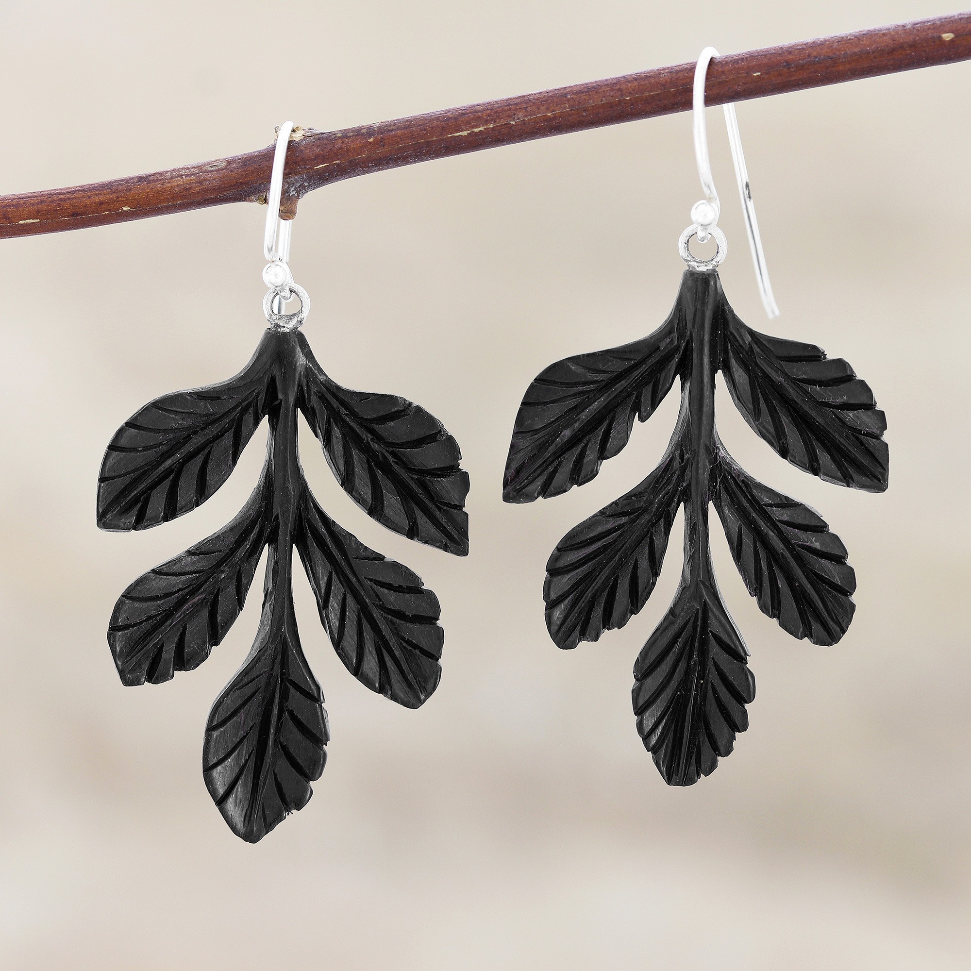 Intricate hand-carved leaf bouquets hang from sterling silver ear wires in these dangle earrings designed by India's Sapna Mehta. The earrings are crafted from ebony wood -- a finely-grained wood prized for its natural beauty.