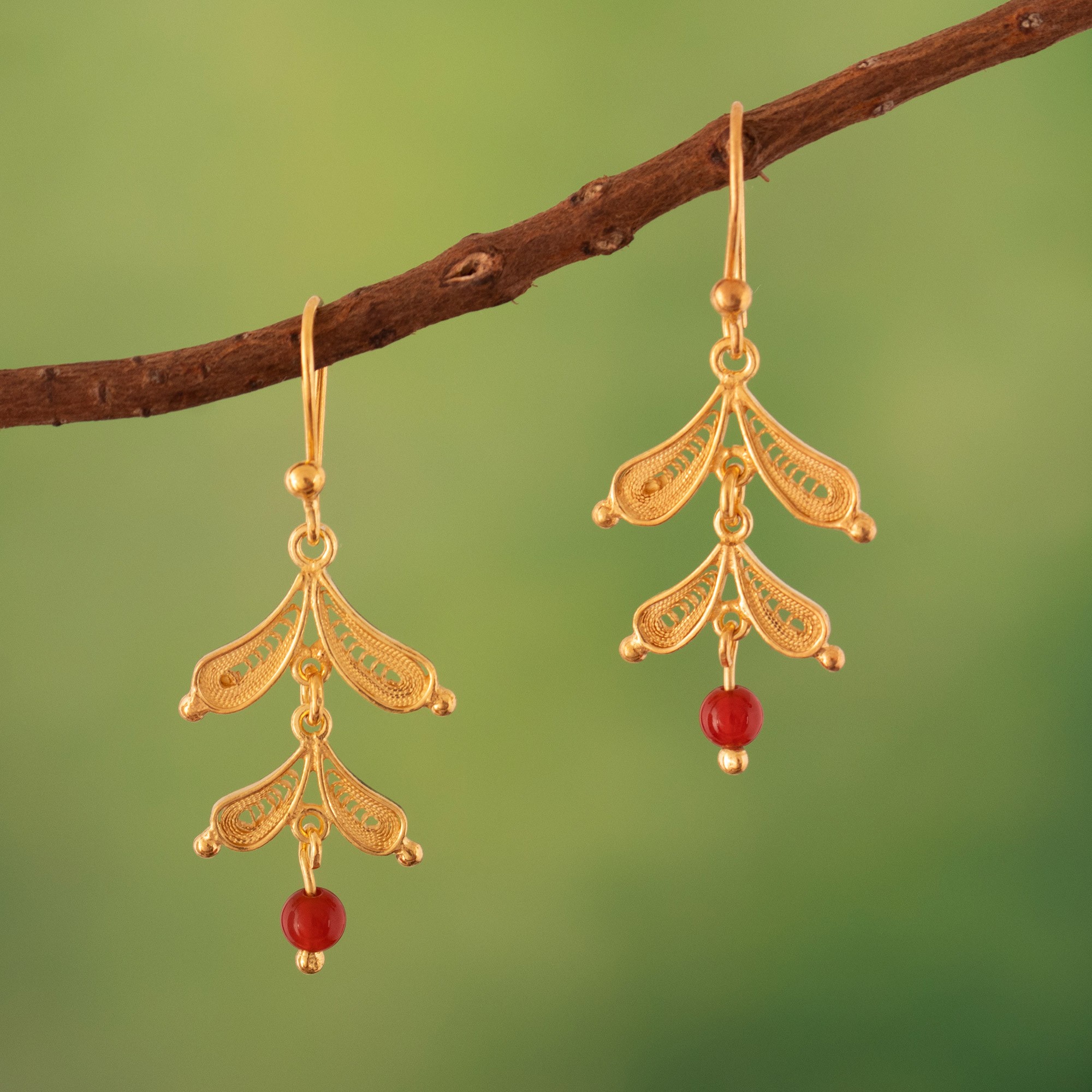 In these enchanting gold-plated leaf dangle earrings, every element is meticulously shaped and perfected, embodying the intricate lace-like beauty that characterizes the renowned filigree technique. Designed by Peru's Alfredo Inga, the lovely earrings feature vibrant carnelian beads that subtly sway in a graceful motion. These exquisite accessories feature a gleaming polish that adds a touch of sophistication and elegance.